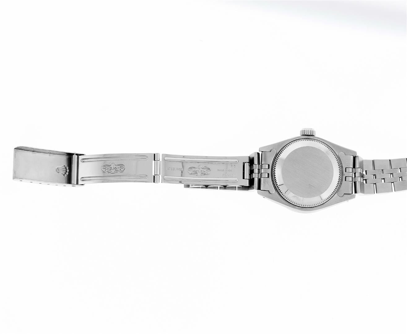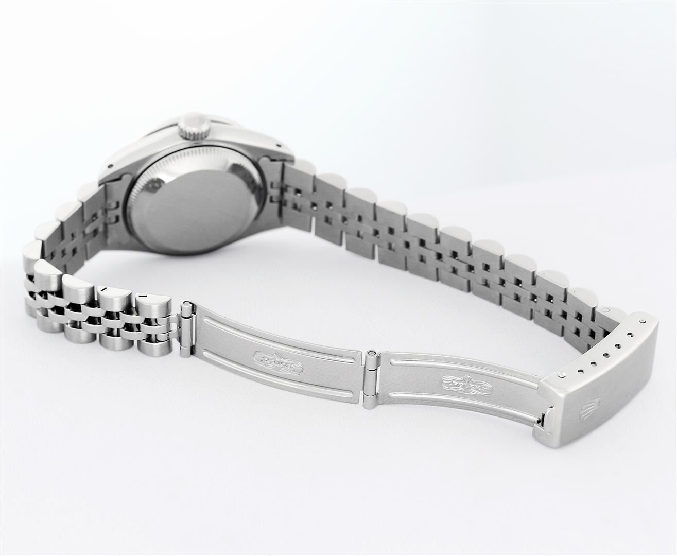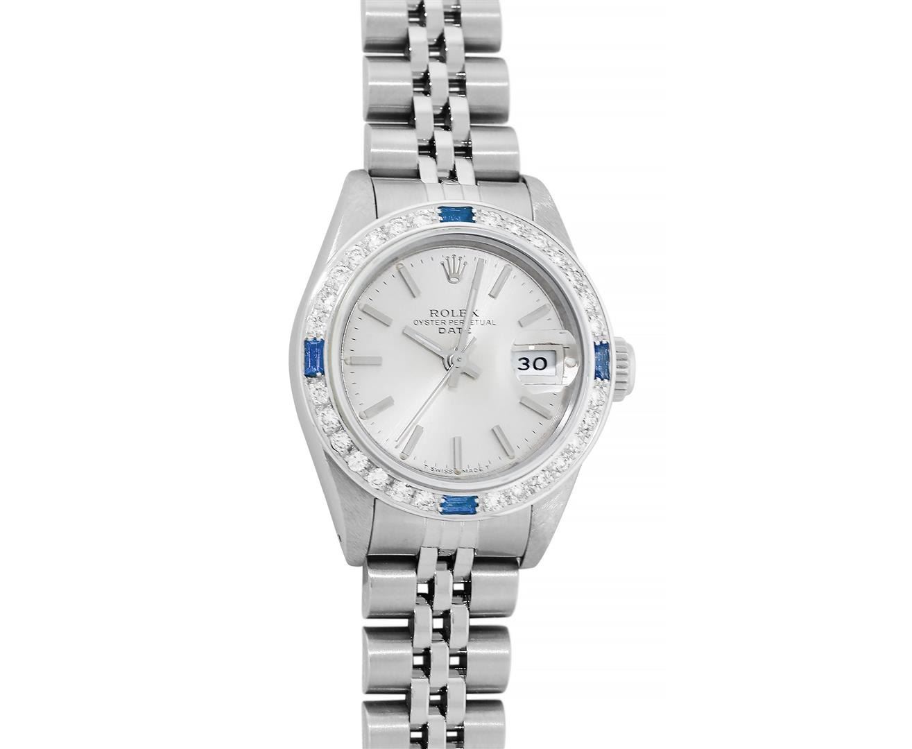 One Ladies Pre Owned Quickset Stainless Steel Rolex Datejust Polished Bright with Satin Finish, Serviced & Electronically Tested, Rolex Stainless Steel Case: 26mm, Rolex Stainless Steel Crown, Custom Bezel: New 18K White Gold Beadset And Sapphire Bezel, Stone Count: 28 Diamonds + 4 Sapphires, Diamond Color: G To H, Clarity: SI-VS. Custom Crystal: New Sapphire With Magnified Date Window. Custom Hands: New Luminescent Hands. Rolex Movement: Quickset Automatic Winding Movement 2130. Rolex Dial: Silver Index Dial With Luminescent Dots & Dash Track. Date Window: 3 O'Clock Position Date Display, Model: Sapphire Quickset Datejust. Condition: G-6 Extra Fine. Rolex Bracelet: Stainless Steel Jubilee Band. Bright Polish & Satin Finish. 6.0 Inch Length, Adjustable. Standard Clasp, With Rolex Logo. This Watch Has Been Serviced Time Tested And Is In Excellent Condition It Is Free Of All Scratches And Dents.