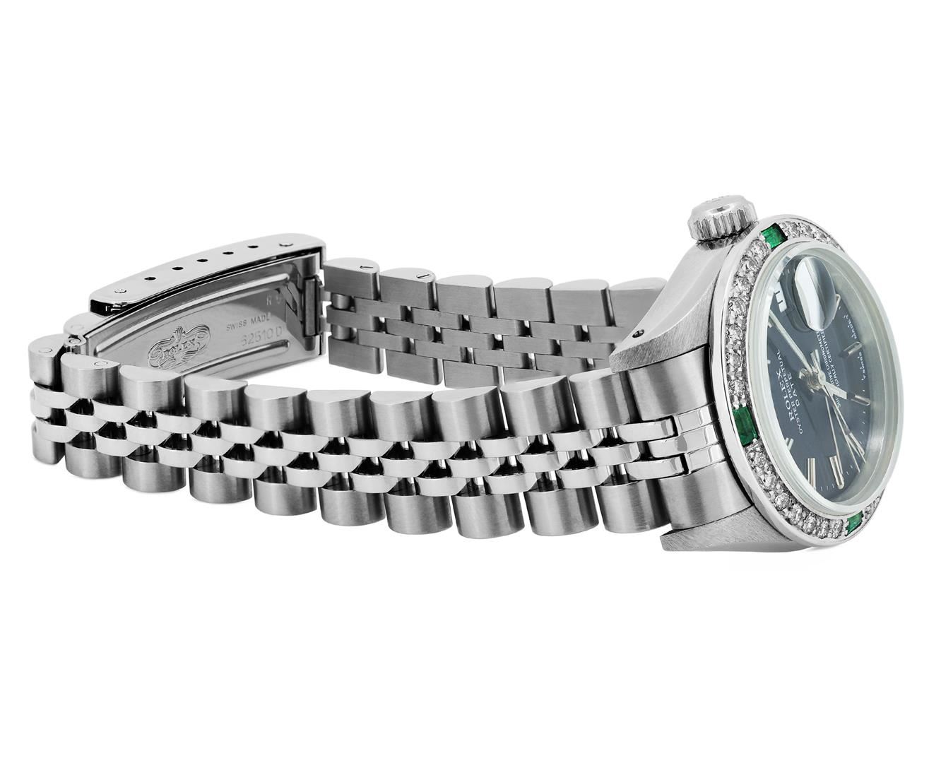 One Rolex Ladies Quickset Pre Owned Stainless Steel Date Wristwatch Polished Bright with Satin Finish, Serviced & Electronically Tested, Stainless Steel Case: 26mm, Stainless Steel Crown, Custom Bezel: New 18K White Gold Emerald Beadset Diamond Bezel, Diamond + Gem Count: 36 Diamonds + 4 Emeralds, Clarity: SI-VS, Color: G to H. Custom Crystal: New Sapphire With Magnified Date Window. Custom Hands: New Luminescent Hands. Rolex Movement: 2135 Automatic Winding Movement. Rolex Dial: Factory Black Dial With Index Hour Markers And Lumi Dots. Date Window: 3 O'Clock Position Date Display, Model: Quickset Datejust. Condition: G-6 Extra Fine. Rolex Bracelet: Stainless Steel Jubilee Band. Bright Polish & Satin Finish. 6.0 Inch Length, Adjustable. Standard Clasp, With Rolex Logo. This Watch Has Been Serviced And Time Tested. It Is In Excellent Condition, Free Of All Scratches And Dents. This Watch Comes With A Rolex Box.