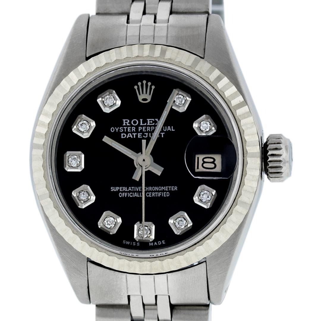 One Ladies Pre Owned Quickset Stainless Steel Rolex Datejust Polished Bright with Satin Finish, Serviced And Electronically Tested, Stainless Steel Case: 26mm, Stainless Steel Crown, Rolex Bezel: 18K White Gold Fluted Bezel. Custom Crystal: New Sapphire With Date Window. Custom Hands: New Luminescent Hands. Rolex Movement: Automatic Winding Movement 2135. Dial: Custom Black Dial With Added Diamonds, Diamond Count: 10 Diamonds On Dial. Date Window: 3 O'Clock Position Date Display, Model: Datejust. Condition: G-6 Extra Fine. Rolex Bracelet: Stainless Steel Jubilee Band. Bright Polish And Satin Finish. 6.0 Inch Length, Adjustable. Standard Clasp, With Rolex Logo. This Watch Has Been Serviced Time Tested And Is In Excellent Condition It Is Free Of All Scratches And Dents.
