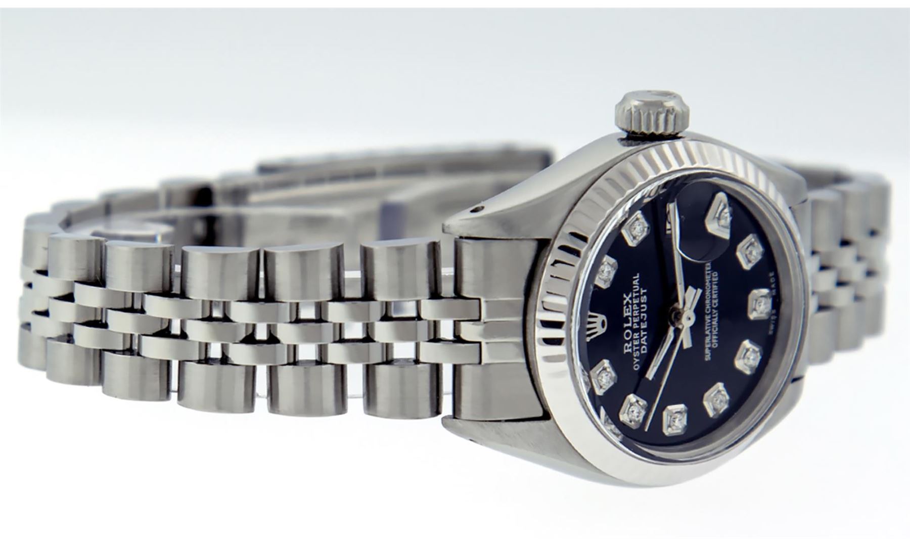 One Ladies Pre Owned Quickset Stainless Steel Rolex Datejust Polished Bright with Satin Finish, Serviced And Electronically Tested, Stainless Steel Case: 26mm, Stainless Steel Crown, Rolex Bezel: 18K White Gold Fluted Bezel. Custom Crystal: New Sapphire With Date Window. Custom Hands: New Luminescent Hands. Rolex Movement: Automatic Winding Movement 2135. Dial: Custom Black Dial With Added Diamonds, Diamond Count: 10 Diamonds On Dial. Date Window: 3 O'Clock Position Date Display, Model: Datejust. Condition: G-6 Extra Fine. Rolex Bracelet: Stainless Steel Jubilee Band. Bright Polish And Satin Finish. 6.0 Inch Length, Adjustable. Standard Clasp, With Rolex Logo. This Watch Has Been Serviced Time Tested And Is In Excellent Condition It Is Free Of All Scratches And Dents.
