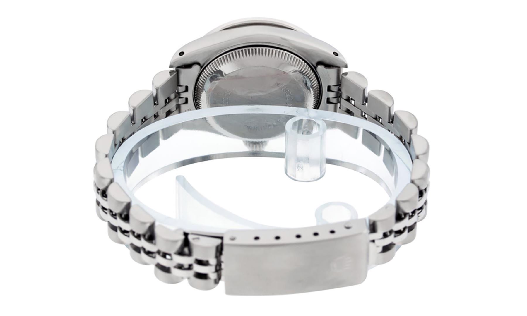 One Ladies Pre Owned Quickset Stainless Steel Rolex Datejust Polished Bright with Satin Finish, Serviced And Electronically Tested, Stainless Steel Case: 26mm, Stainless Steel Crown, Custom Bezel: New 18K White Gold Sapphire Beadset Diamond Bezel, Diamond
