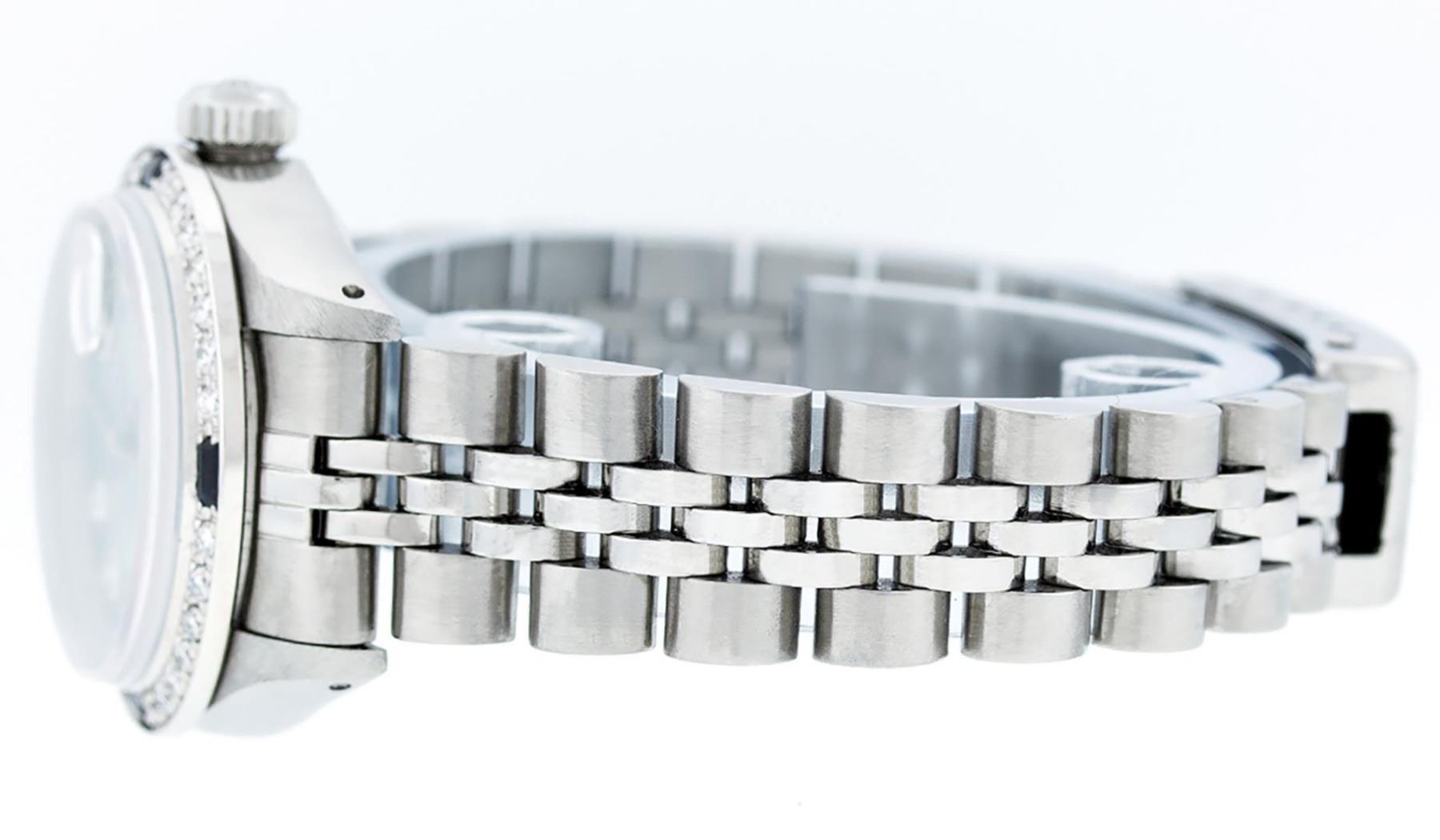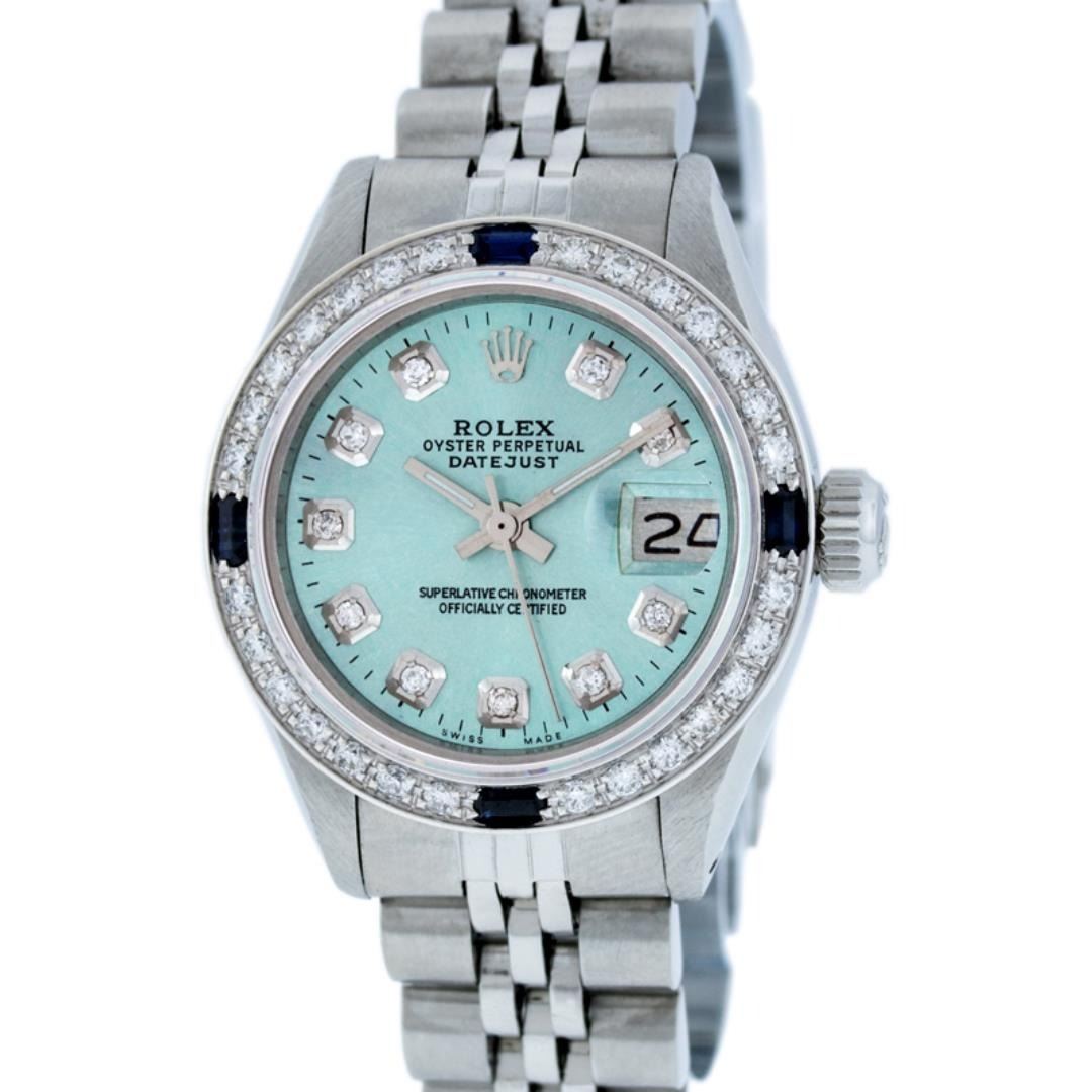 One Ladies Pre Owned Quickset Stainless Steel Rolex Datejust Polished Bright with Satin Finish, Serviced And Electronically Tested, Stainless Steel Case: 26mm, Stainless Steel Crown, Custom Bezel: New 18K White Gold Sapphire Beadset Diamond Bezel, Diamond + Gem Count: 28 Diamonds + 4 Sapphires. Custom Crystal: New Sapphire With Date Window. Custom Hands: New Luminescent Hands. Rolex Movement: Automatic Winding Movement 2135. Custom Dial: Custom Blue Dial With Added Diamond Hour Markers And Dash Track, 10 Diamond in Dial. Date Window: 3 O'Clock Position Date Display, Model: Datejust. Condition: G-6 Extra Fine. Rolex Bracelet: Stainless Steel Jubilee Band. Bright Polish And Satin Finish. 6.0 Inch Length, Adjustable. Standard Clasp, With Rolex Logo. This Watch Has Been Serviced Time Tested And Is In Excellent Condition It Is Free Of All Scratches And Dents.