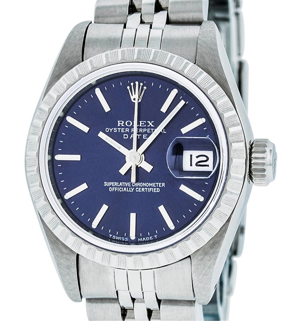 One Ladies Pre Owned Quickset Stainless Steel Rolex Date Polished Bright with Satin Finish, Serviced & Electronically Tested, Rolex Stainless Steel Case: 26mm, Rolex Stainless Steel Crown, Rolex Bezel: Stainless Steel Engine Turn Bezel. Crystal: Sapphire With Magnified Date Window. Hands: Luminescent Hands. Rolex Movement: Automatic Winding Movement 2230. Rolex Dial: Blue Index Dial With Luminescent Dots & Dash Track. Date Window: 3 O'Clock Position Date Display, Model: Sapphire Quickset Date Caliber 2230. Condition: G-6 Extra Fine. Rolex Bracelet: Stainless Steel Jubilee Band. Bright Polish & Satin Finish. 6.0 Inch Length, Adjustable. Standard Clasp, With Rolex Logo. This Watch Has Been Serviced Time Tested And Is In Excellent Condition It Is Free Of All Scratches And Dents.