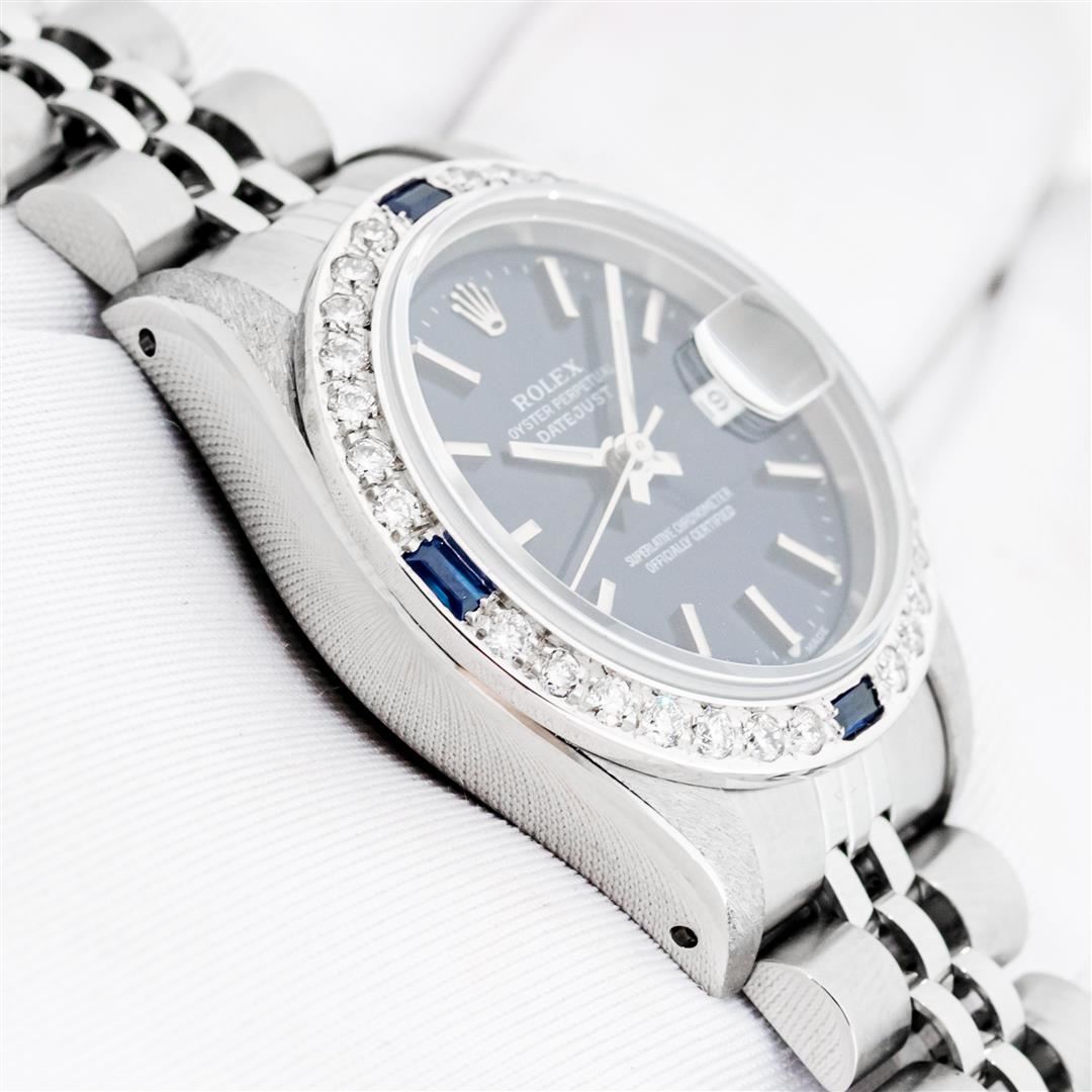 One Ladies Pre Owned Quickset Stainless Steel Rolex Datejust Polished Bright with Satin Finish Serviced & Electronically Tested, Rolex Stainless Steel Case: 26mm, Rolex Stainless Steel Crown, Custom Bezel: New White Gold Beadset + Sapphire Diamond Bezel, Diamond Count: 28 Diamonds + 4 Sapphire Bezels. Custom Crystal: New Sapphire With Date Window. Custom Hands: New Luminescent Hands. Rolex Movement: Automatic Winding Movement. Rolex Dial: Blue Index Dial With Dash Track. Date Window: 3 O'Clock Position Date Display, Model: Datejust. Condition: G-6 Extra Fine. Rolex Bracelet: Stainless Steel Jubilee Band With Rolex Crown On Buckle. Bright Polish & Satin Finish. Band Length: 6.0 Inch Length, Adjustable. Standard Clasp, With Rolex Logo. This Watch Has Been Serviced Time Tested And Is In Excellent Condition It Is Free Of All Scratches And Dents.