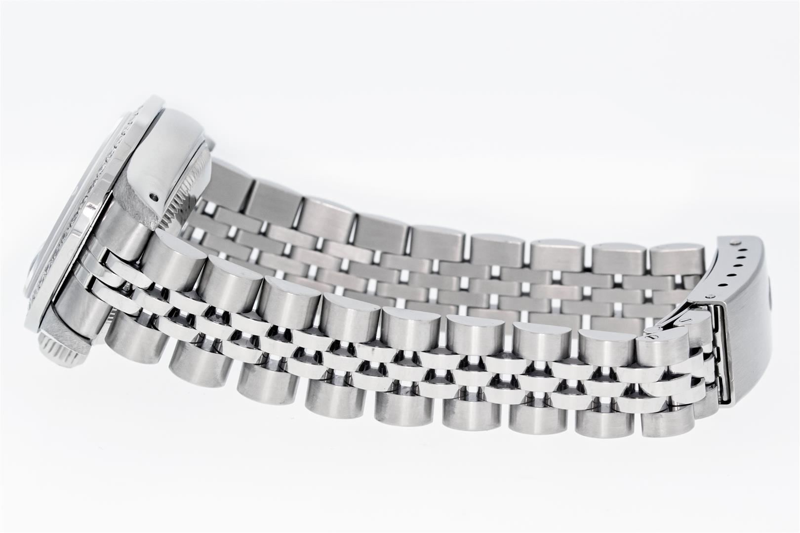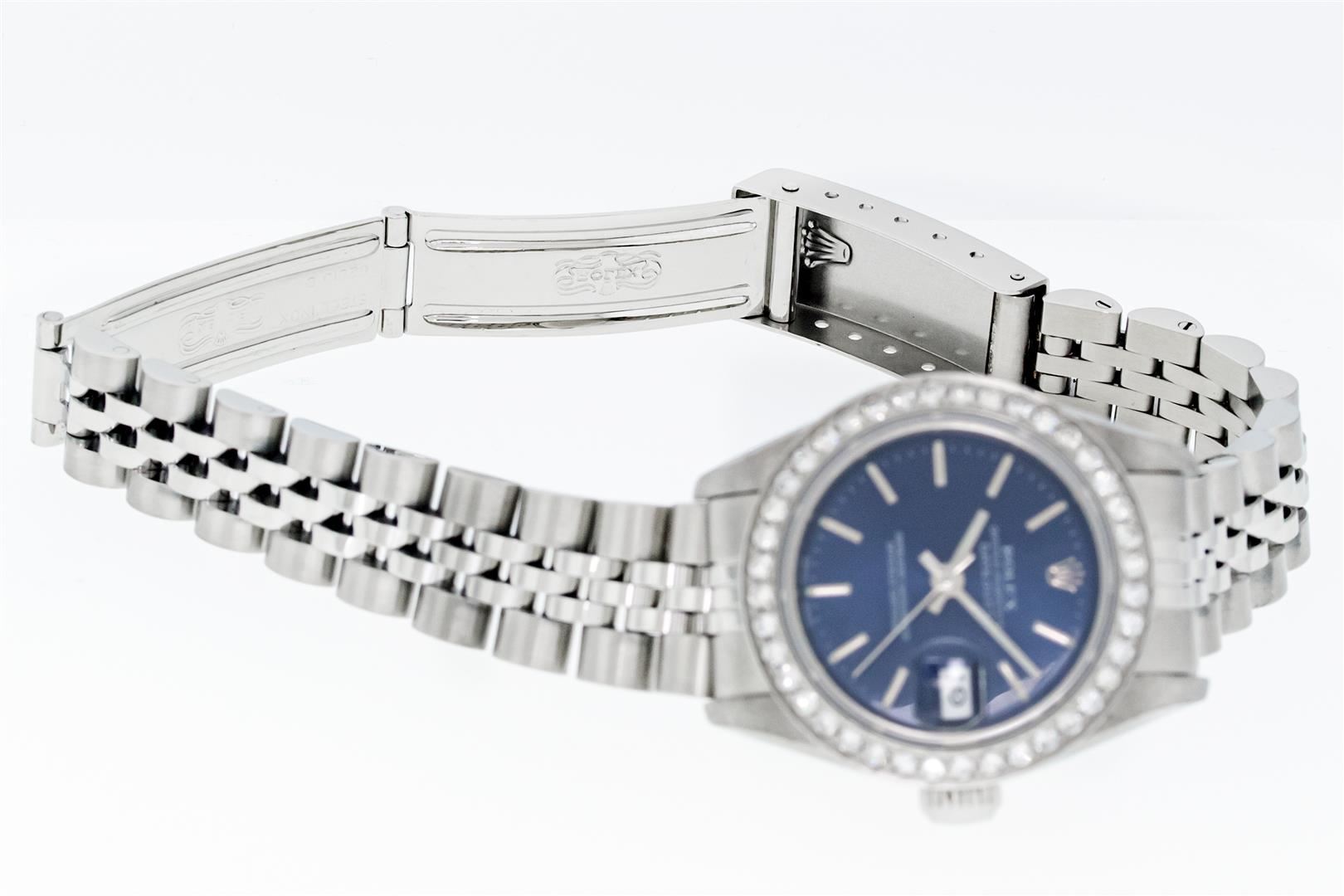One Ladies Pre Owned Stainless Steel Rolex Datejust Polished Bright with Satin Finish Serviced & Electronically Tested, Rolex Stainless Steel Case: 26mm, Rolex Stainless Steel Crown, Custom Bezel: New Stainless Steel Beadset Diamond Bezel, Diamond Count: 40 Diamonds On Bezel Dial. Custom Crystal: New Sapphire With Date Window. Custom Hands: New Luminescent Hands. Rolex Movement: Automatic Winding Movement. Rolex Dial: Blue Index Dial With Dash Track. Date Window: 3 O'Clock Position Date Display, Model: Datejust. Condition: G-6 Extra Fine. Rolex Bracelet: Stainless Steel Jubilee Band With Rolex Crown On Buckle. Bright Polish & Satin Finish. Band Length: 6.0 Inch Length, Adjustable. Standard Clasp, With Rolex Logo. This Watch Has Been Serviced Time Tested And Is In Excellent Condition It Is Free Of All Scratches And Dents.