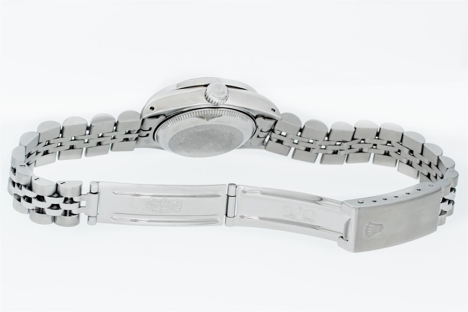 One Ladies Pre Owned Stainless Steel Rolex Datejust Polished Bright with Satin Finish Serviced & Electronically Tested, Rolex Stainless Steel Case: 26mm, Rolex Stainless Steel Crown, Custom Bezel: New Stainless Steel Beadset Diamond Bezel, Diamond Count: 40 Diamonds On Bezel Dial. Custom Crystal: New Sapphire With Date Window. Custom Hands: New Luminescent Hands. Rolex Movement: Automatic Winding Movement. Rolex Dial: Blue Index Dial With Dash Track. Date Window: 3 O'Clock Position Date Display, Model: Datejust. Condition: G-6 Extra Fine. Rolex Bracelet: Stainless Steel Jubilee Band With Rolex Crown On Buckle. Bright Polish & Satin Finish. Band Length: 6.0 Inch Length, Adjustable. Standard Clasp, With Rolex Logo. This Watch Has Been Serviced Time Tested And Is In Excellent Condition It Is Free Of All Scratches And Dents.