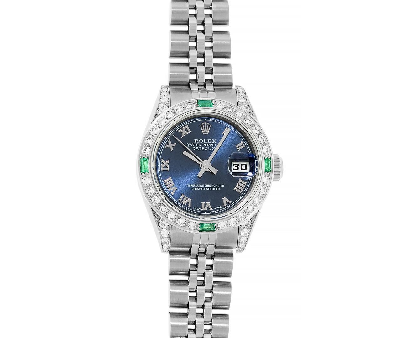 One Ladies Pre Owned Quickset Stainless Steel Rolex Datejust Polished Bright with Satin Finish, Serviced & Electronically Tested, Rolex Stainless Steel Case: 26mm, Custom Diamond Lugs: Added Diamonds On Lugs, Diamond Count: 24 Diamonds On Bezel, Color: G To H, Clartity: SI-VS. Rolex Stainless Steel Crown, Custom Bezel: New 18K White Gold Beadset And Emerald Bezel, Stone Count: 28 Diamonds + 4 Emeralds, Diamond Color: G To H, Clarity: SI-VS. Custom Crystal: New Sapphire With Magnified Date Window. Custom Hands: New Hands. Rolex Movement: Quickset Automatic Winding Movement 2230. Rolex Dial: Blue Roman Dial With Square Track. Date Window: 3 O'Clock Position Date Display, Model: Sapphire Quickset Datejust. Condition: G-6 Extra Fine. Rolex Bracelet: Stainless Steel Jubilee Band. Bright Polish & Satin Finish. 6.0 Inch Length, Adjustable. Standard Clasp, With Rolex Logo. This Watch Has Been Serviced Time Tested And Is In Excellent Condition It Is Free Of All Scratches And Dents.