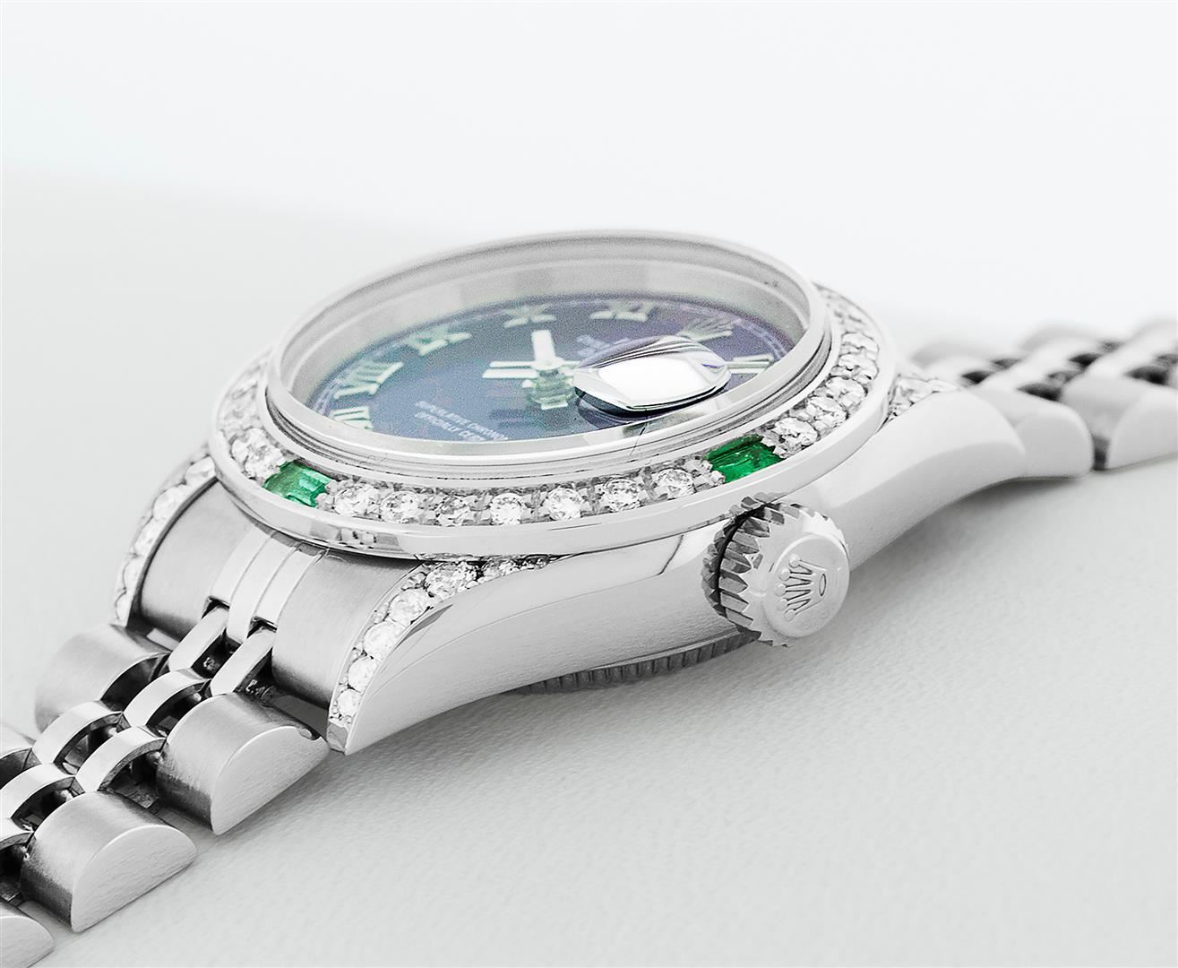 One Ladies Pre Owned Quickset Stainless Steel Rolex Datejust Polished Bright with Satin Finish, Serviced & Electronically Tested, Rolex Stainless Steel Case: 26mm, Custom Diamond Lugs: Added Diamonds On Lugs, Diamond Count: 24 Diamonds On Bezel, Color: G To H, Clartity: SI-VS. Rolex Stainless Steel Crown, Custom Bezel: New 18K White Gold Beadset And Emerald Bezel, Stone Count: 28 Diamonds + 4 Emeralds, Diamond Color: G To H, Clarity: SI-VS. Custom Crystal: New Sapphire With Magnified Date Window. Custom Hands: New Hands. Rolex Movement: Quickset Automatic Winding Movement 2230. Rolex Dial: Blue Roman Dial With Square Track. Date Window: 3 O'Clock Position Date Display, Model: Sapphire Quickset Datejust. Condition: G-6 Extra Fine. Rolex Bracelet: Stainless Steel Jubilee Band. Bright Polish & Satin Finish. 6.0 Inch Length, Adjustable. Standard Clasp, With Rolex Logo. This Watch Has Been Serviced Time Tested And Is In Excellent Condition It Is Free Of All Scratches And Dents.