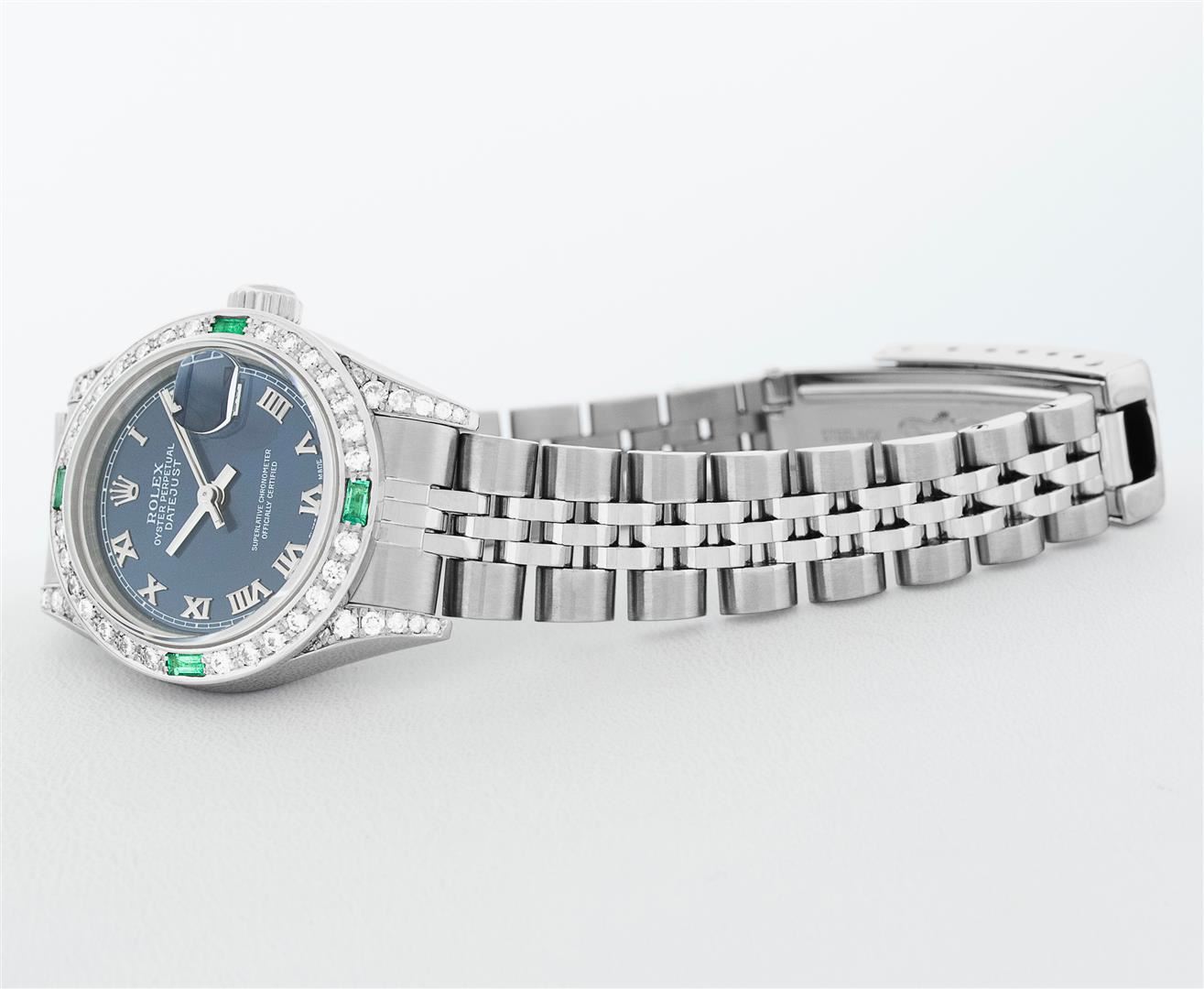 One Ladies Pre Owned Quickset Stainless Steel Rolex Datejust Polished Bright with Satin Finish, Serviced & Electronically Tested, Rolex Stainless Steel Case: 26mm, Custom Diamond Lugs: Added Diamonds On Lugs, Diamond Count: 24 Diamonds On Bezel, Color: G To H, Clartity: SI-VS. Rolex Stainless Steel Crown, Custom Bezel: New 18K White Gold Beadset And Emerald Bezel, Stone Count: 28 Diamonds + 4 Emeralds, Diamond Color: G To H, Clarity: SI-VS. Custom Crystal: New Sapphire With Magnified Date Window. Custom Hands: New Hands. Rolex Movement: Quickset Automatic Winding Movement 2230. Rolex Dial: Blue Roman Dial With Square Track. Date Window: 3 O'Clock Position Date Display, Model: Sapphire Quickset Datejust. Condition: G-6 Extra Fine. Rolex Bracelet: Stainless Steel Jubilee Band. Bright Polish & Satin Finish. 6.0 Inch Length, Adjustable. Standard Clasp, With Rolex Logo. This Watch Has Been Serviced Time Tested And Is In Excellent Condition It Is Free Of All Scratches And Dents.