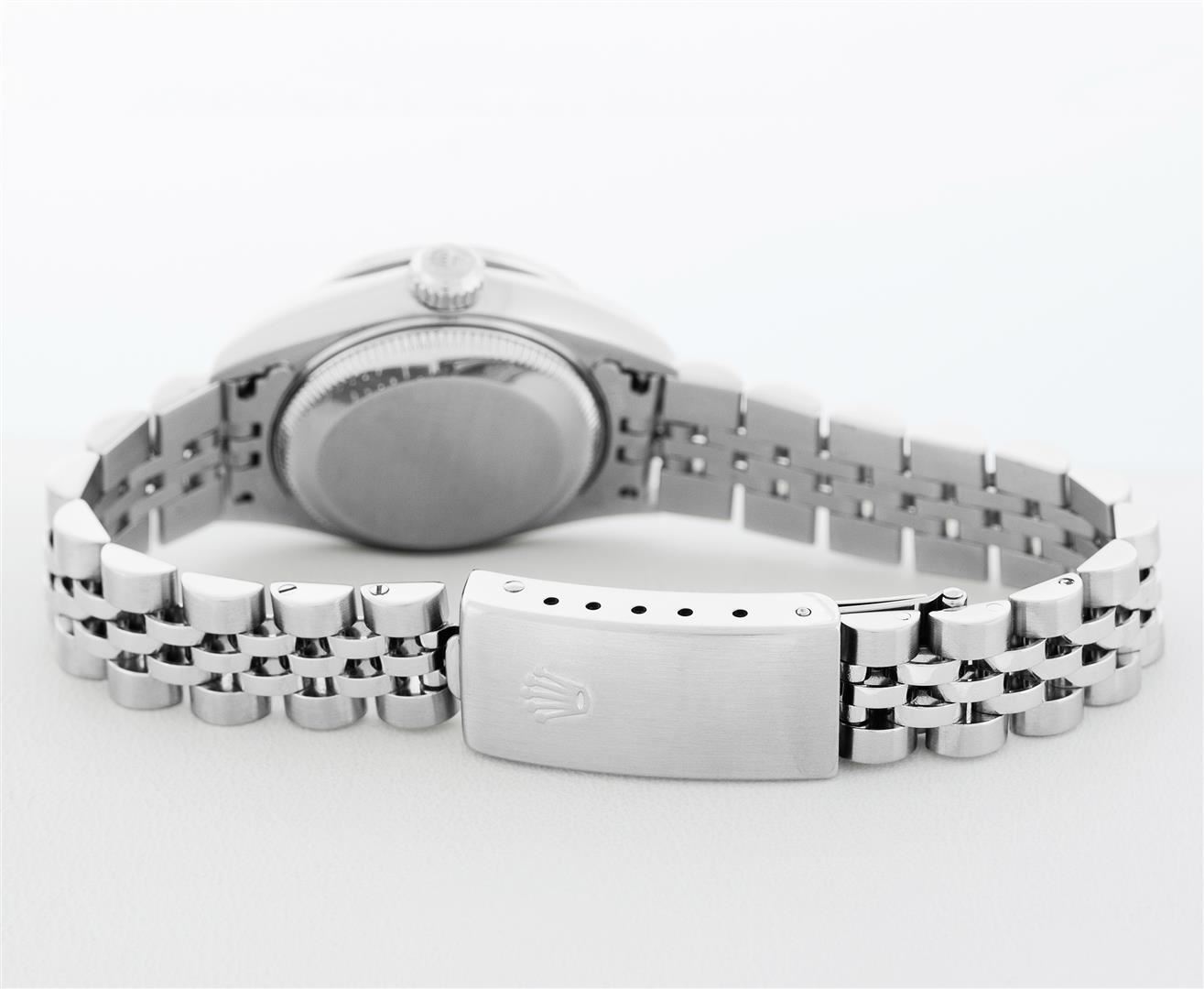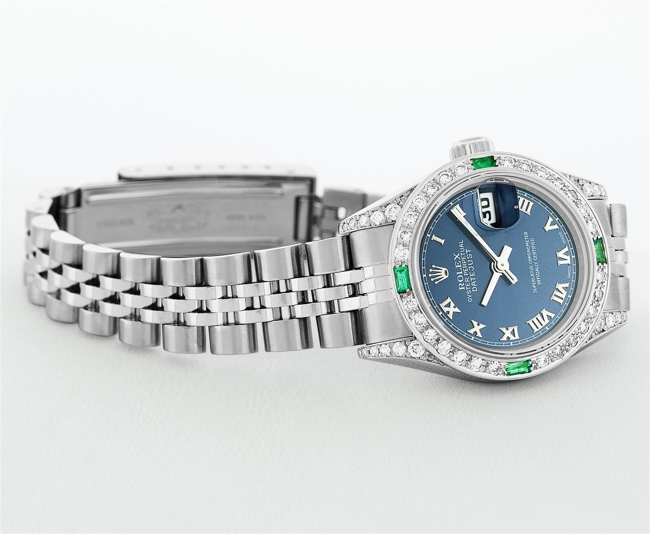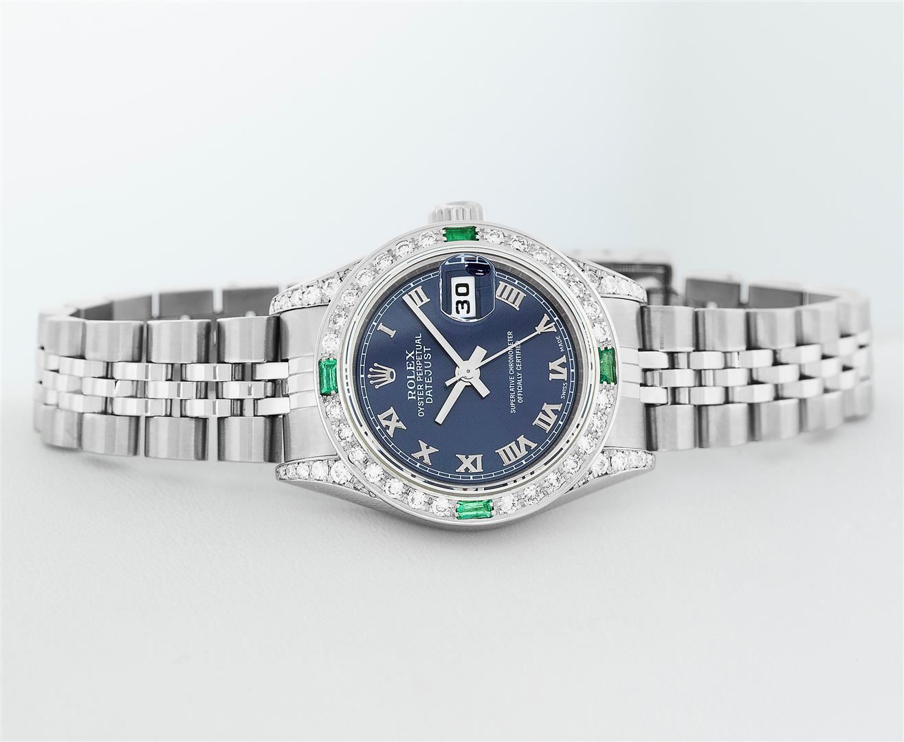 One Ladies Pre Owned Quickset Stainless Steel Rolex Datejust Polished Bright with Satin Finish, Serviced & Electronically Tested, Rolex Stainless Steel Case: 26mm, Custom Diamond Lugs: Added Diamonds On Lugs, Diamond Count: 24 Diamonds On Bezel, Color: G To H, Clartity: SI-VS. Rolex Stainless Steel Crown, Custom Bezel: New 18K White Gold Beadset And Emerald Bezel, Stone Count: 28 Diamonds + 4 Emeralds, Diamond Color: G To H, Clarity: SI-VS. Custom Crystal: New Sapphire With Magnified Date Window. Custom Hands: New Hands. Rolex Movement: Quickset Automatic Winding Movement 2230. Rolex Dial: Blue Roman Dial With Square Track. Date Window: 3 O'Clock Position Date Display, Model: Sapphire Quickset Datejust. Condition: G-6 Extra Fine. Rolex Bracelet: Stainless Steel Jubilee Band. Bright Polish & Satin Finish. 6.0 Inch Length, Adjustable. Standard Clasp, With Rolex Logo. This Watch Has Been Serviced Time Tested And Is In Excellent Condition It Is Free Of All Scratches And Dents.