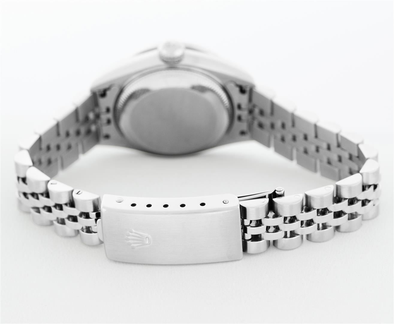 One Ladies Pre Owned Quickset Stainless Steel Rolex Datejust Polished Bright with Satin Finish, Serviced & Electronically Tested, Rolex Stainless Steel Case: 26mm, Custom Diamond Lugs: Added Diamonds On Lugs, Diamond Count: 24 Diamonds On Bezel, Color: G To H, Clartity: SI-VS. Rolex Stainless Steel Crown, Custom Bezel: New 18K White Gold Beadset And Sapphire Bezel, Stone Count: 28 Diamonds + 4 Sapphires, Diamond Color: G To H, Clarity: SI-VS. Custom Crystal: New Sapphire With Magnified Date Window. Custom Hands: New Hands. Rolex Movement: Quickset Automatic Winding Movement 2230. Rolex Dial: Blue Roman Dial With Square Track. Date Window: 3 O'Clock Position Date Display, Model: Sapphire Quickset Datejust. Condition: G-6 Extra Fine. Rolex Bracelet: Stainless Steel Jubilee Band. Bright Polish & Satin Finish. 6.0 Inch Length, Adjustable. Standard Clasp, With Rolex Logo. This Watch Has Been Serviced Time Tested And Is In Excellent Condition It Is Free Of All Scratches And Dents.