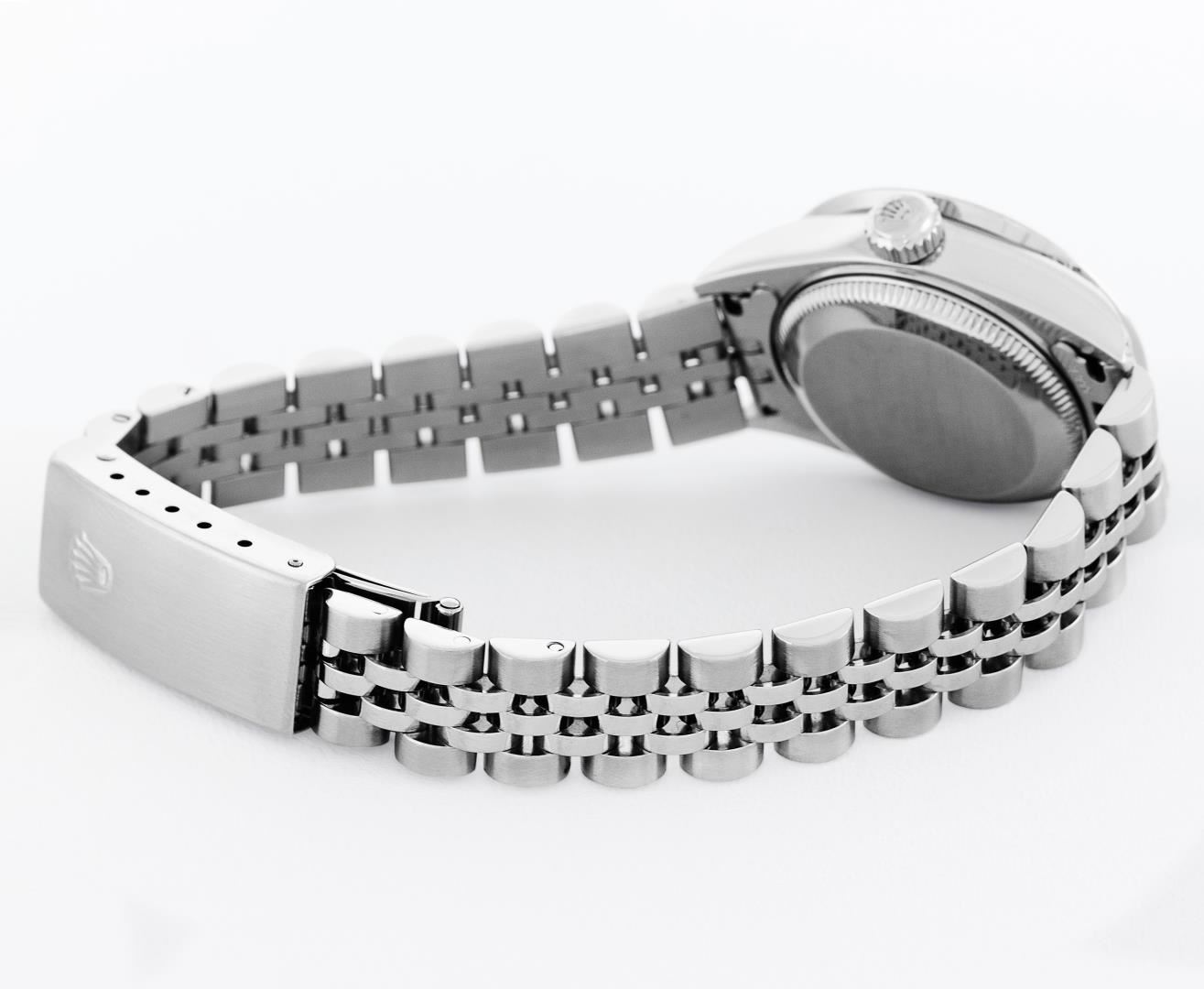 One Ladies Pre Owned Quickset Stainless Steel Rolex Datejust Polished Bright with Satin Finish, Serviced & Electronically Tested, Rolex Stainless Steel Case: 26mm, Custom Diamond Lugs: Added Diamonds On Lugs, Diamond Count: 24 Diamonds On Bezel, Color: G To H, Clartity: SI-VS. Rolex Stainless Steel Crown, Custom Bezel: New Stainless Steel Beadset Diamond Bezel, Stone Count: 40 Diamonds On Bezel, Diamond Color: G To H, Clarity: SI-VS. Custom Crystal: New Sapphire With Magnified Date Window. Custom Hands: New Hands. Rolex Movement: Quickset Automatic Winding Movement 2235. Rolex Dial: Blue Roman Dial With Square Track. Date Window: 3 O'Clock Position Date Display, Model: Sapphire Quickset Datejust. Condition: G-6 Extra Fine. Rolex Bracelet: Stainless Steel Jubilee Band. Bright Polish & Satin Finish. 6.0 Inch Length, Adjustable. Standard Clasp, With Rolex Logo. This Watch Has Been Serviced Time Tested And Is In Excellent Condition It Is Free Of All Scratches And Dents.