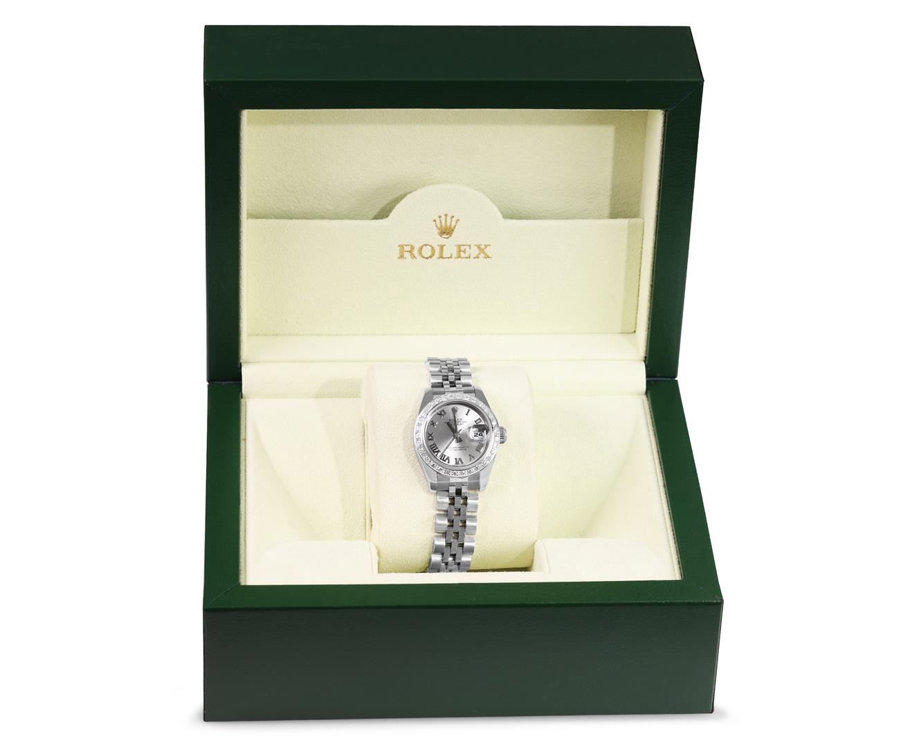 One Rolex Ladies Pre Owned Stainless Steel Datejust Wristwatch Polished Bright with Satin Finish, Serviced & Electronically Tested, Stainless Steel Case: 26mm, Stainless Steel Crown, Custom Bezel: New 18K White Gold Beadset Diamond Bezel, Diamond Count: 32 Diamonds, Total Weight .70 Carat, Clarity: SI-VS, Color: G to H. Crystal: Sapphire With Magnified Date Window. Custom Hands: Solid Hands. Rolex Movement: 2235 Automatic Winding Movement. Rolex Dial: Factory Silver Dial With Roman Hour Markers. Date Window: 3 O'Clock Position Date Display, Model: Sapphire Quickset Datejust. Condition: G-6 Extra Fine. Rolex Bracelet: Stainless Steel Jubilee Band. Bright Polish & Satin Finish. 6.0 Inch Length, Adjustable. Hidden Clasp, With Rolex Logo. This Watch Has Been Serviced And Time Tested. It Is In Excellent Condition, Free Of All Scratches And Dents. This Watch Comes With A Rolex Box.