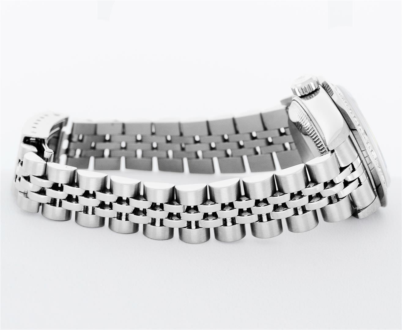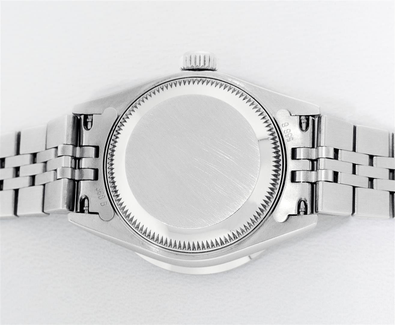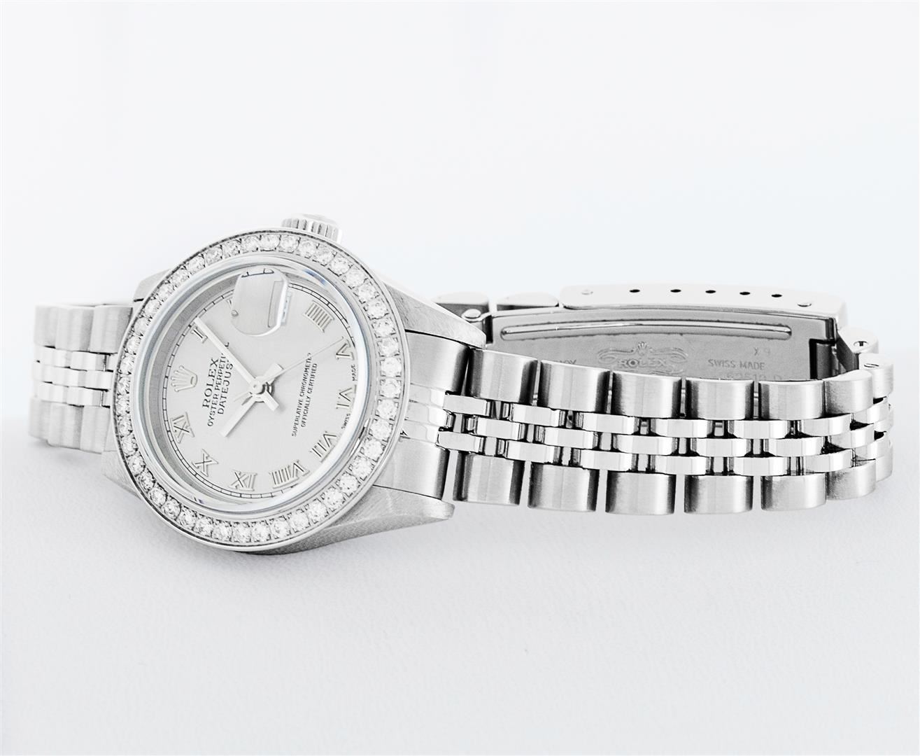 One Ladies Pre Owned Quickset Stainless Steel Rolex Datejust Polished Bright with Satin Finish, Serviced & Electronically Tested, Rolex Stainless Steel Case: 26mm. Rolex Stainless Steel Crown, Custom Bezel: New Stainless Steel Beadset Diamond Bezel, Stone Count: 32 Diamonds On Bezel, Diamond Color: G To H, Clarity: SI-VS. Custom Crystal: New Sapphire With Magnified Date Window. Custom Hands: New Hands. Rolex Movement: Quickset Automatic Winding Movement 2230. Rolex Dial: Gray Roman With Square Track. Date Window: 3 O'Clock Position Date Display, Model: Sapphire Quickset Datejust. Condition: G-6 Extra Fine. Rolex Bracelet: Stainless Steel Jubilee Band. Bright Polish & Satin Finish. 6.0 Inch Length, Adjustable. Standard Clasp, With Rolex Logo. This Watch Has Been Serviced Time Tested And Is In Excellent Condition It Is Free Of All Scratches And Dents.