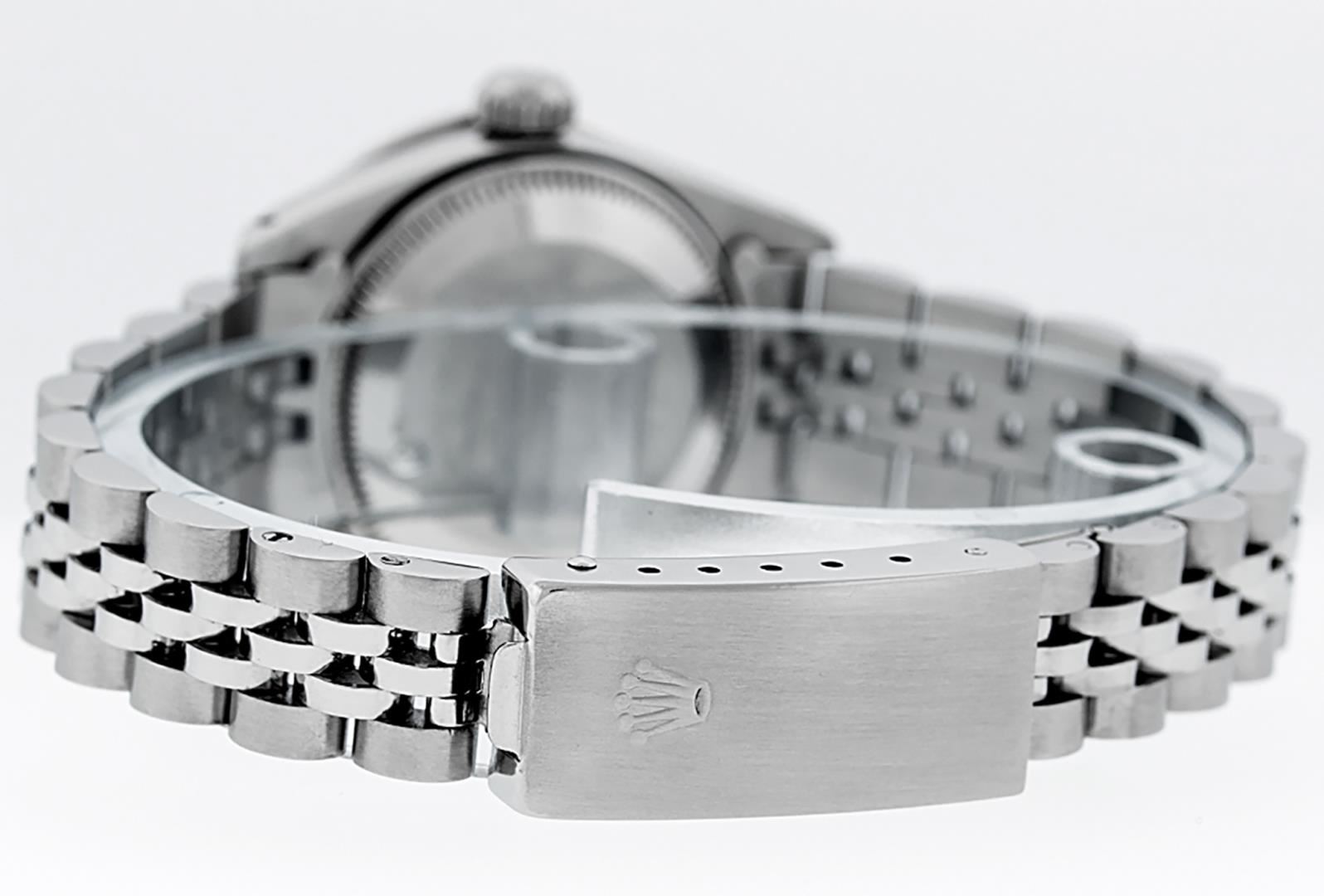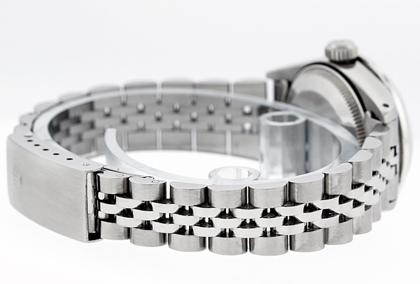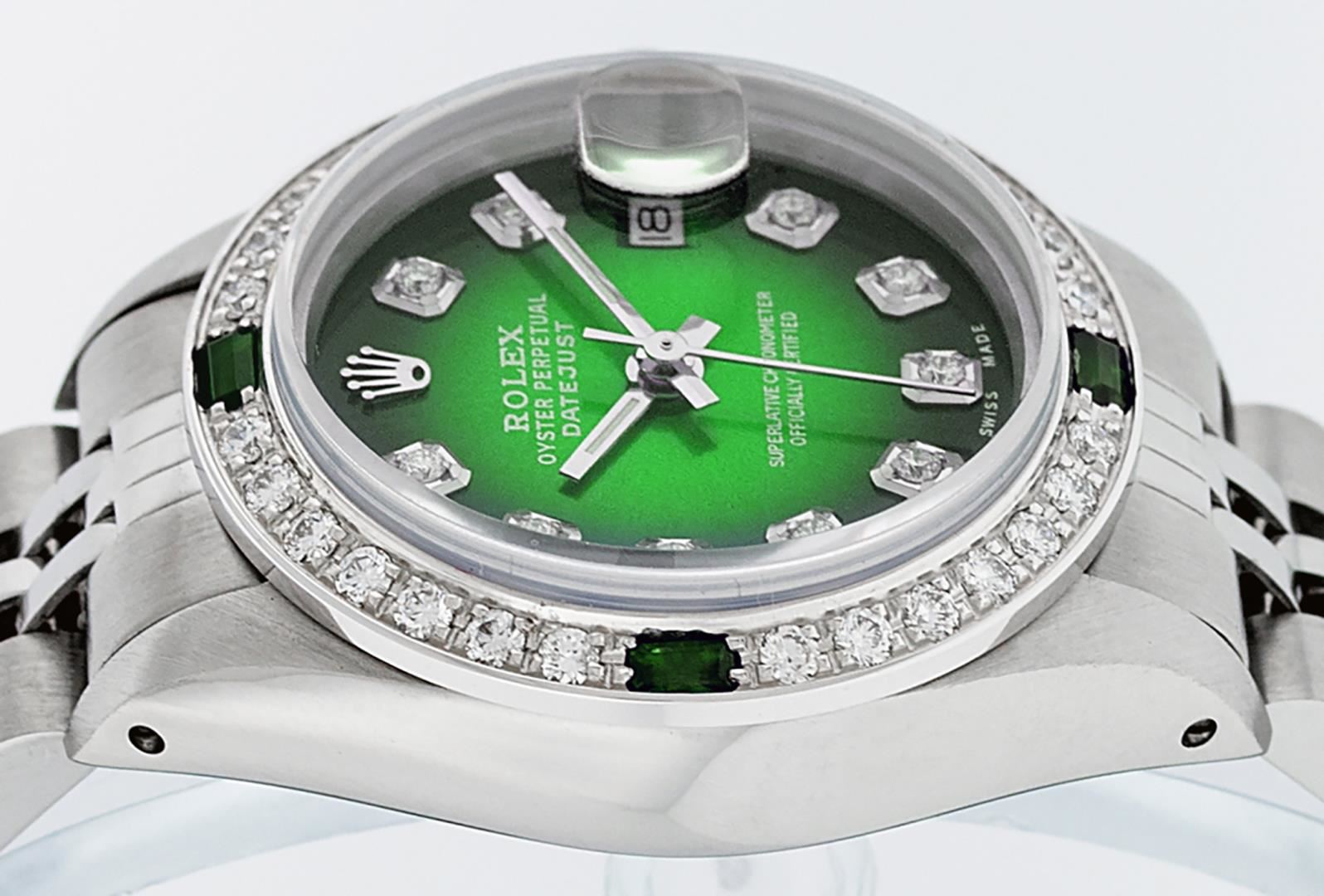 One Ladies Pre Owned Quickset Stainless Steel Rolex Datejust Polished Bright with Satin Finish, Serviced And Electronically Tested, Stainless Steel Case: 26mm, Stainless Steel Crown, Custom Bezel: New 18K White Gold Emerald Beadset Diamond Bezel, Diamond + Gem Count: 28 Diamonds + 4 Emeralds. Custom Crystal: New Sapphire With Date Window. Custom Hands: New Luminescent Hands. Rolex Movement: Automatic Winding Movement 2135. Custom Dial: Custom Green Vignette With Added Diamond Hour Markers. Diamond Count: 10 Diamonds On Dial. Date Window: 3 O'Clock Position Date Display, Model: Datejust. Condition: G-6 Extra Fine. Rolex Bracelet: Stainless Steel Jubilee Band. Bright Polish And Satin Finish. 6.0 Inch Length, Adjustable. Standard Clasp, With Rolex Logo. This Watch Has Been Serviced Time Tested And Is In Excellent Condition It Is Free Of All Scratches And Dents.