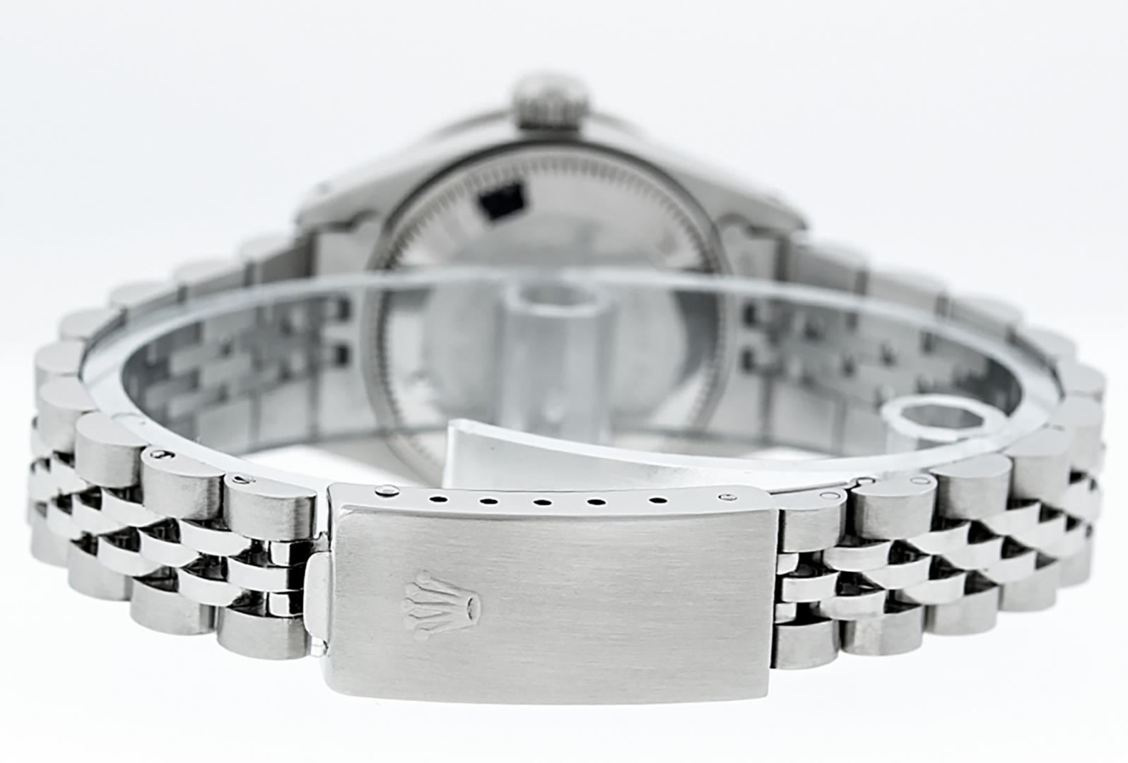One Ladies Pre Owned Quickset Stainless Steel Rolex Datejust Polished Bright with Satin Finish, Serviced And Electronically Tested, Stainless Steel Case: 26mm, Stainless Steel Crown, Custom Bezel: New 18K White Gold Emerald Beadset Diamond Bezel, Diamond + Gem Count: 28 Diamonds + 4 Emeralds. Custom Crystal: New Sapphire With Date Window. Custom Hands: New Luminescent Hands. Rolex Movement: Automatic Winding Movement 2135. Custom Dial: Custom Green Vignette With Added Diamond Hour Markers. Diamond Count: 10 Diamonds On Dial. Date Window: 3 O'Clock Position Date Display, Model: Datejust. Condition: G-6 Extra Fine. Rolex Bracelet: Stainless Steel Jubilee Band. Bright Polish And Satin Finish. 6.0 Inch Length, Adjustable. Standard Clasp, With Rolex Logo. This Watch Has Been Serviced Time Tested And Is In Excellent Condition It Is Free Of All Scratches And Dents.