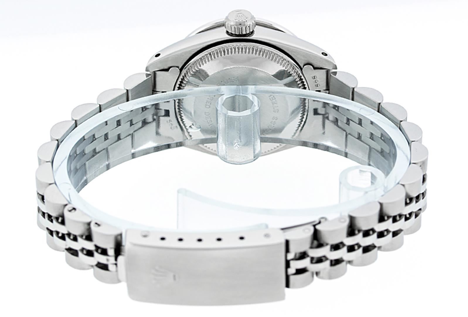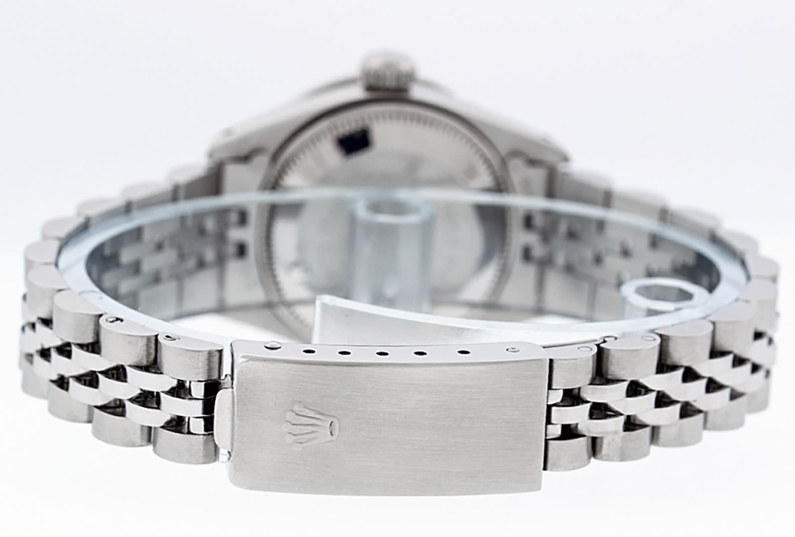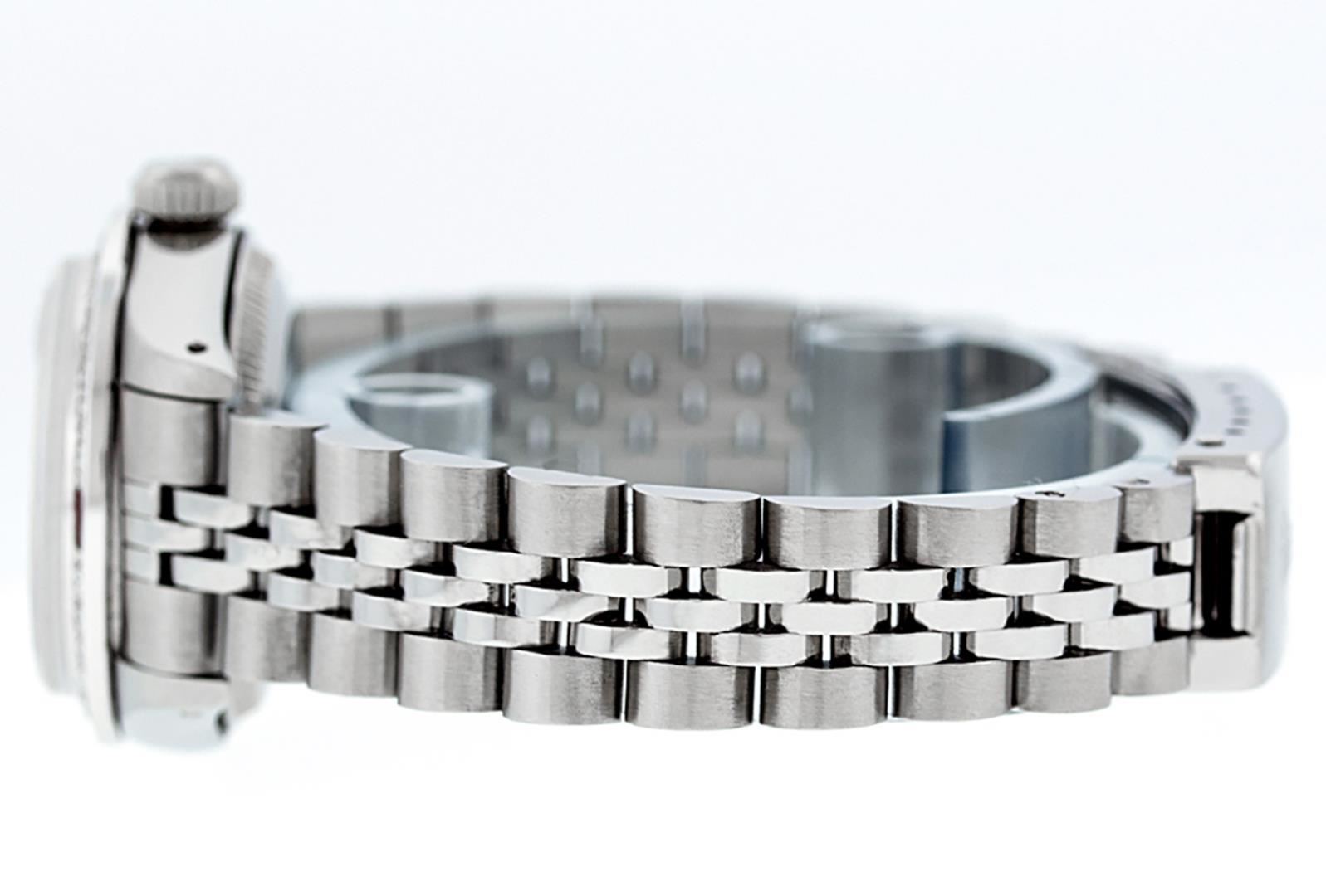 One Ladies Pre Owned Quickset Stainless Steel Rolex Datejust Polished Bright with Satin Finish, Serviced And Electronically Tested, Stainless Steel Case: 26mm, Stainless Steel Crown, Custom Bezel: New 18K White Gold Ruby Beadset Diamond Bezel, Diamond + Gem Count: 28 Diamonds + 4 Rubies. Custom Crystal: New Sapphire With Date Window. Custom Hands: New Luminescent Hands. Rolex Movement: Automatic Winding Movement 2135. Custom Dial: Custom Red Vignette Dial With Diamond Hour Markers, 10 Diamond On Dial. Date Window: 3 O'Clock Position Date Display, Model: Datejust. Condition: G-6 Extra Fine. Rolex Bracelet: Stainless Steel Jubilee Band. Bright Polish And Satin Finish. 6.0 Inch Length, Adjustable. Standard Clasp, With Rolex Logo. This Watch Has Been Serviced Time Tested And Is In Excellent Condition It Is Free Of All Scratches And Dents.
