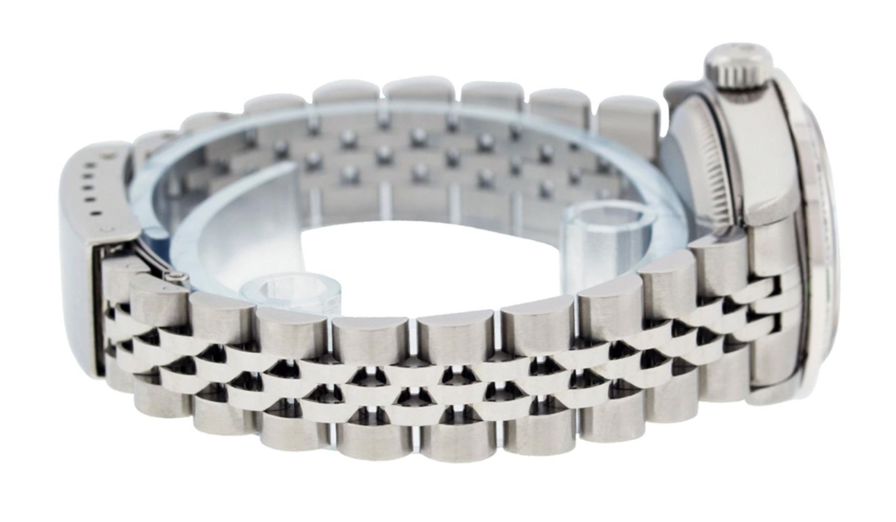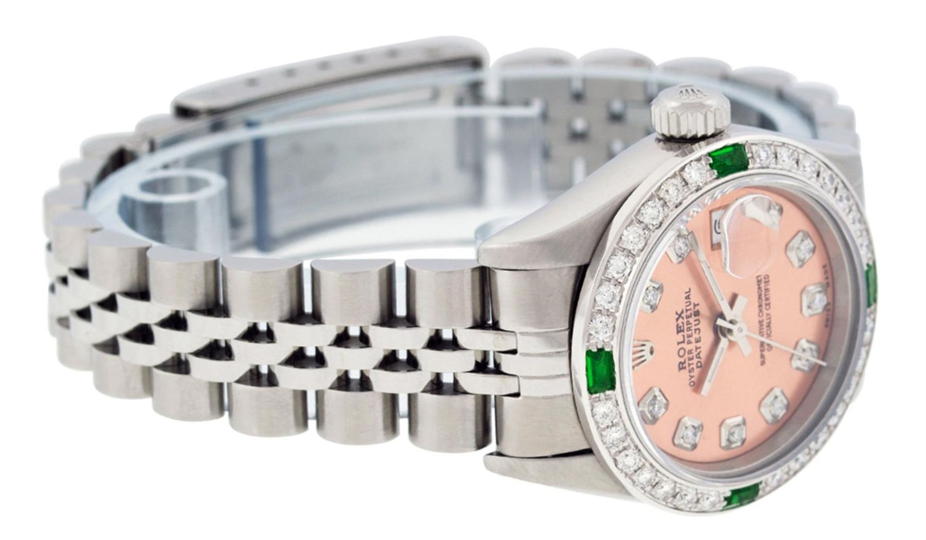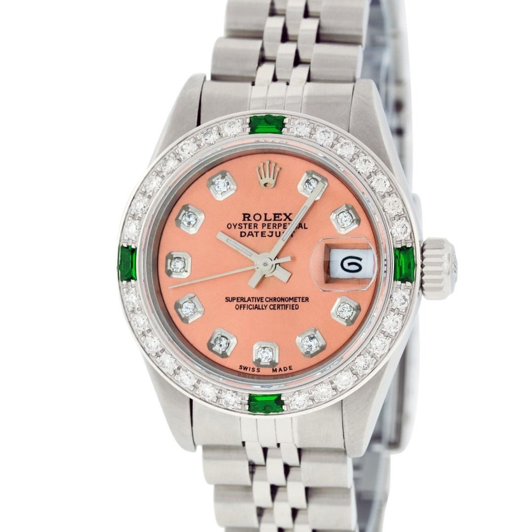 One Quickset Ladies Pre Owned Quickset Stainless Steel Rolex Datejust Polished Bright with Satin Finish, Serviced And Electronically Tested, Stainless Steel Case: 26mm, Stainless Steel Crown, Custom Bezel: New 18K White Gold Diamond + Emerald Beadset Diamond Bezel, Stone Count: 28 Diamonds + 4 Emeralds. Custom Crystal: New Sapphire With Magnified Date Window. Custom Hands: New Luminescent Hands. Rolex Movement: Automatic Winding Movement 2235. Custom Dial: Custom Salmon Dial With Added Diamonds, 10 Diamonds On Dial. Date Window: 3 O'Clock Position Date Display, Model: Quickset 2235 Datejust. Condition: G-6 Extra Fine. Rolex Bracelet: Stainless Steel Jubilee Band. Bright Polish And Satin Finish. 6.0 Inch Length, Adjustable. Standard Clasp, With Rolex Logo. This Watch Has Been Serviced Time Tested And Is In Excellent Condition It Is Free Of All Scratches And Dents.