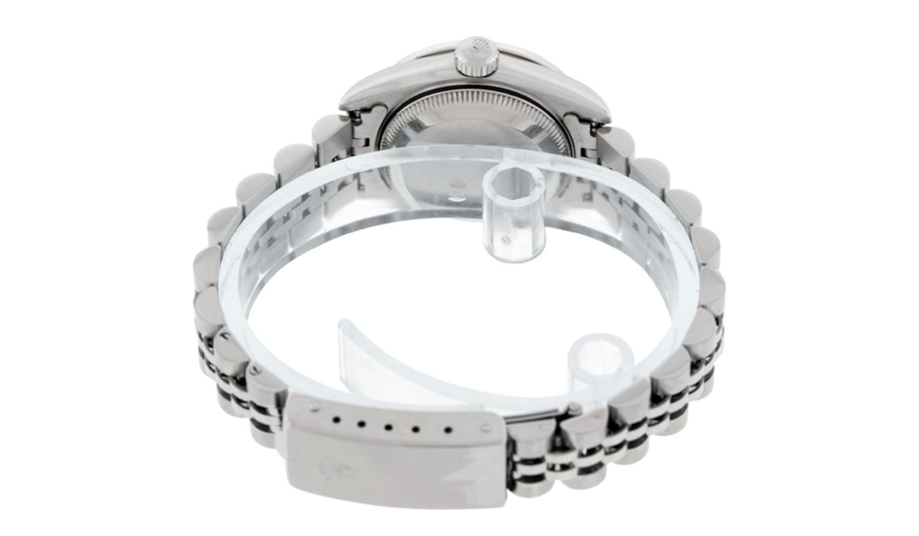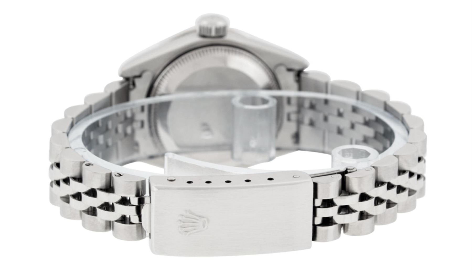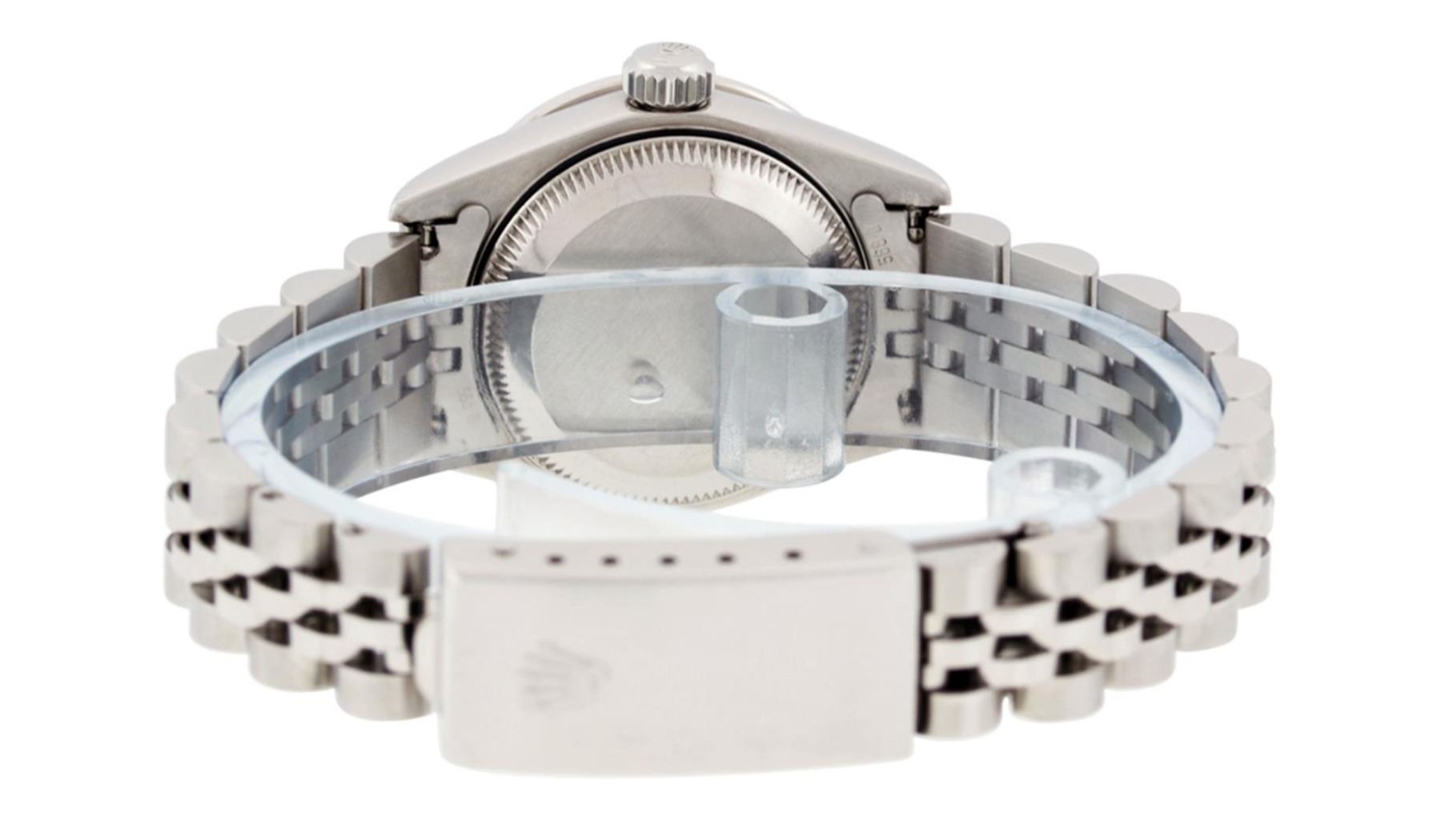One Quickset Ladies Pre Owned Quickset Stainless Steel Rolex Datejust Polished Bright with Satin Finish, Serviced And Electronically Tested, Stainless Steel Case: 26mm, Stainless Steel Crown, Custom Bezel: New 18K White Gold Diamond + Emerald Beadset Diamond Bezel, Stone Count: 28 Diamonds + 4 Emeralds. Custom Crystal: New Sapphire With Magnified Date Window. Custom Hands: New Luminescent Hands. Rolex Movement: Automatic Winding Movement 2235. Custom Dial: Custom Salmon Dial With Added Diamonds, 10 Diamonds On Dial. Date Window: 3 O'Clock Position Date Display, Model: Quickset 2235 Datejust. Condition: G-6 Extra Fine. Rolex Bracelet: Stainless Steel Jubilee Band. Bright Polish And Satin Finish. 6.0 Inch Length, Adjustable. Standard Clasp, With Rolex Logo. This Watch Has Been Serviced Time Tested And Is In Excellent Condition It Is Free Of All Scratches And Dents.