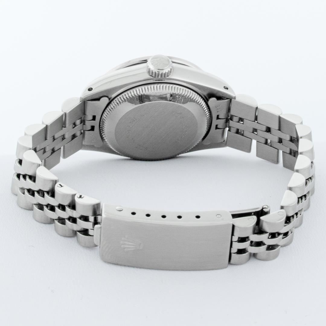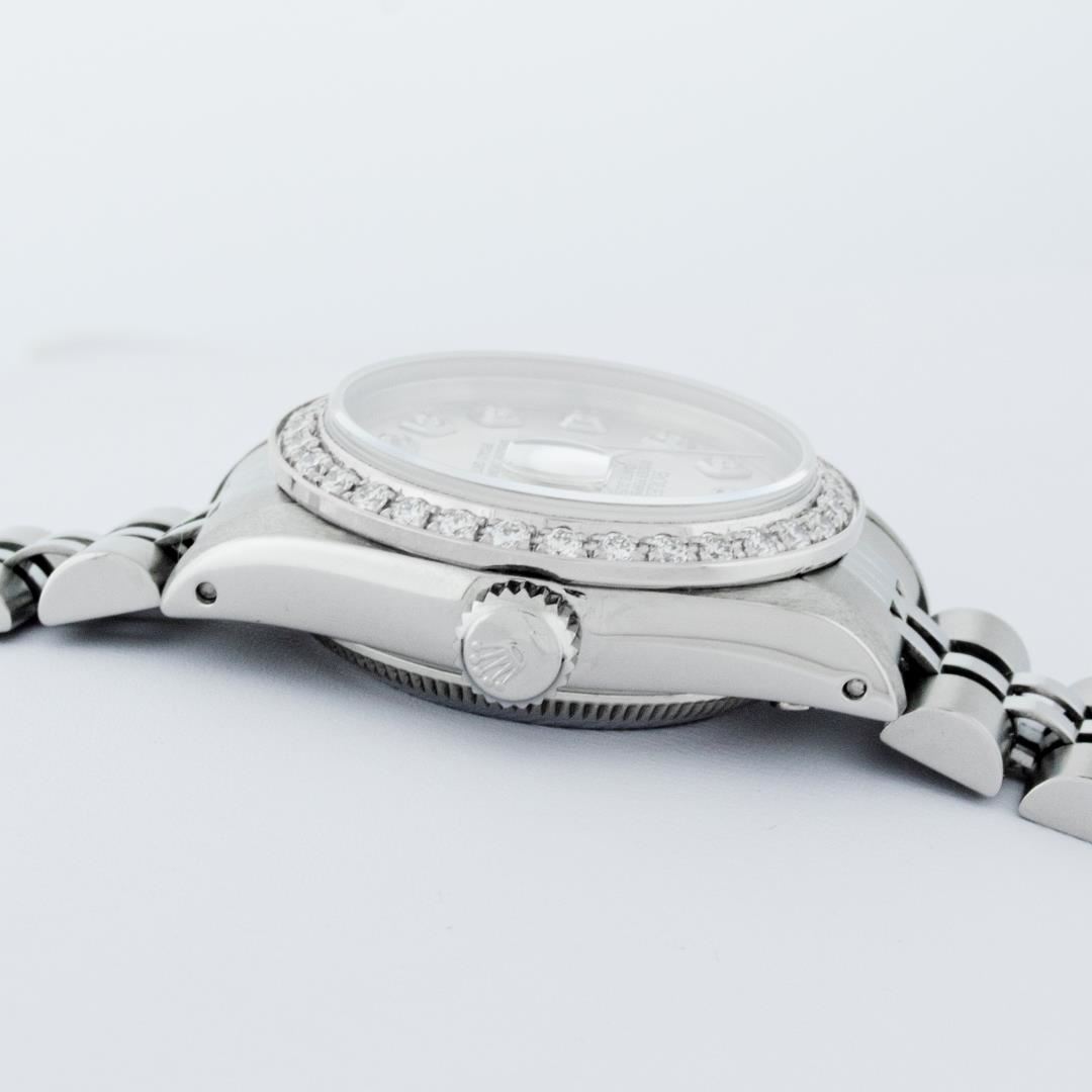 One Ladies Rolex Pre Owned Quickset Stainless Steel Rolex Datejust Wristwatch Polished Bright with Satin Finish, Serviced And Electronically Tested, Stainless Steel Case: 26mm, Stainless Steel Crown, Custom Bezel: New 18K White Gold Beadset Diamond Bezel, Diamond Count: 32 Diamonds. Custom Crystal: New Sapphire With Date Window. Custom Hands: New Luminescent Hands. Rolex Movement: Automatic Winding Movement 2135. Custom Dial: Custom Silver Dial With Added Diamond Hour Markers, Diamond Count: 10 Diamonds On Dial. Date Window: 3 O'Clock Position Date Display. Model: Quickset Datejust. Condition: G-6 Extra Fine. Rolex Bracelet: Stainless Steel Jubilee Band. Bright Polish And Satin Finish. 6.0 Inch Length, Adjustable. Standard Clasp, With Rolex Logo. This Watch Has Been Serviced Time Tested And Is In Excellent Condition It Is Free Of All Scratches And Dents.