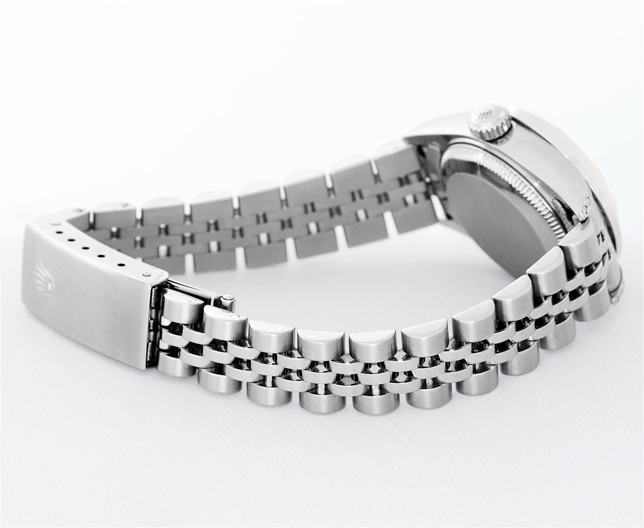 One Ladies Pre Owned Quickset Stainless Steel Rolex Datejust Polished Bright with Satin Finish, Serviced & Electronically Tested, Rolex Stainless Steel Case: 26mm, Custom Diamond Lugs: Added Diamonds On Lugs, Diamond Count: 24 Diamonds On Bezel, Color: G To H, Clartity: SI-VS. Rolex Stainless Steel Crown, Custom Bezel: New 18K White Gold Beadset Diamond Bezel, Stone Count: 32 Diamonds, Diamond Color: G To H, Clarity: SI-VS. Custom Crystal: New Sapphire With Magnified Date Window. Custom Hands: New Lumi Hands. Rolex Movement: Quickset Automatic Winding Movement 2230. Rolex Dial: Silver Index With Dash Track And Lumi Dots. Date Window: 3 O'Clock Position Date Display, Model: Sapphire Quickset Datejust. Condition: G-6 Extra Fine. Rolex Bracelet: Stainless Steel Jubilee Band. Bright Polish & Satin Finish. 6.0 Inch Length, Adjustable. Standard Clasp, With Rolex Logo. This Watch Has Been Serviced Time Tested And Is In Excellent Condition It Is Free Of All Scratches And Dents.