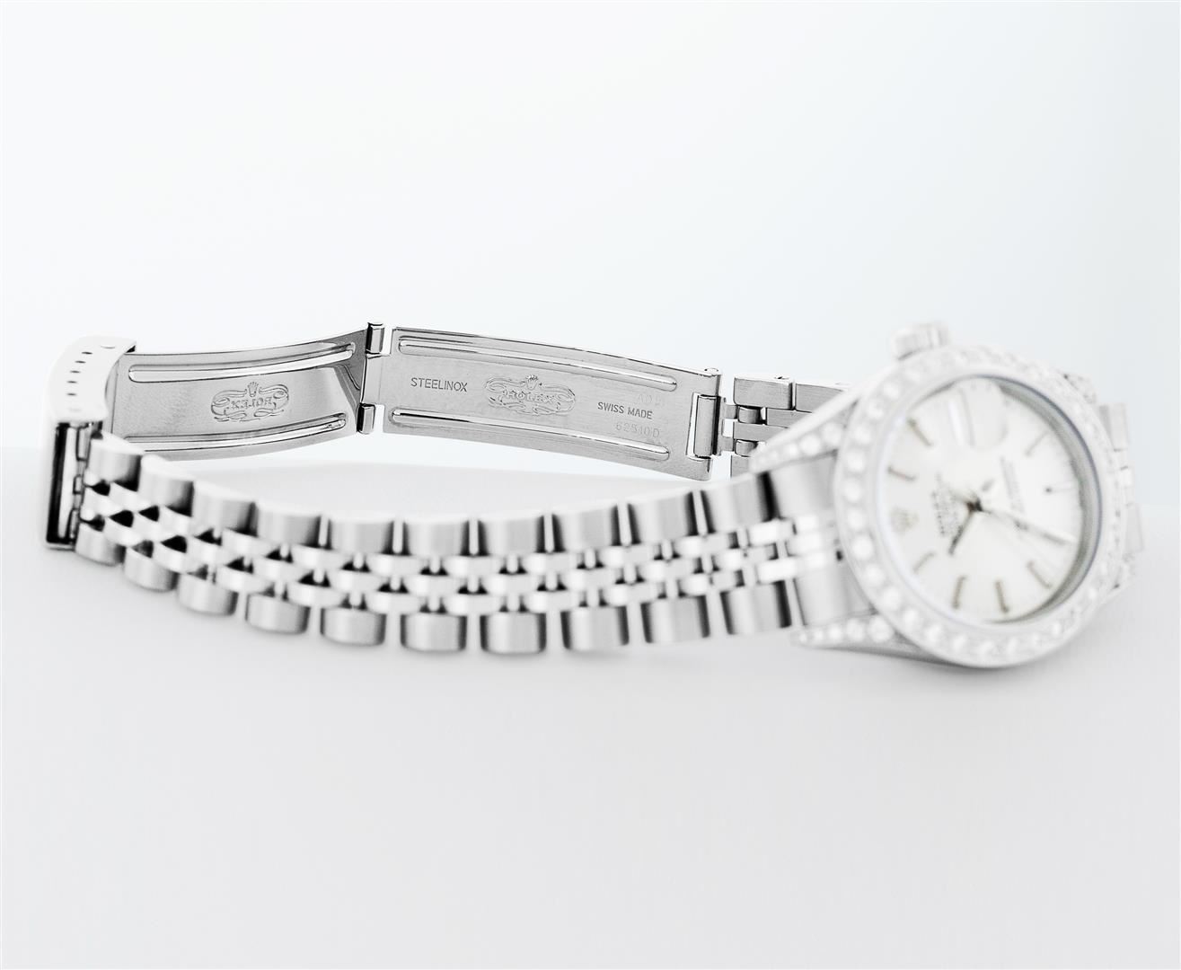 One Ladies Pre Owned Quickset Stainless Steel Rolex Datejust Polished Bright with Satin Finish, Serviced & Electronically Tested, Rolex Stainless Steel Case: 26mm, Custom Diamond Lugs: Added Diamonds On Lugs, Diamond Count: 24 Diamonds On Bezel, Color: G To H, Clartity: SI-VS. Rolex Stainless Steel Crown, Custom Bezel: New 18K White Gold Beadset Diamond Bezel, Stone Count: 32 Diamonds, Diamond Color: G To H, Clarity: SI-VS. Custom Crystal: New Sapphire With Magnified Date Window. Custom Hands: New Lumi Hands. Rolex Movement: Quickset Automatic Winding Movement 2230. Rolex Dial: Silver Index With Dash Track And Lumi Dots. Date Window: 3 O'Clock Position Date Display, Model: Sapphire Quickset Datejust. Condition: G-6 Extra Fine. Rolex Bracelet: Stainless Steel Jubilee Band. Bright Polish & Satin Finish. 6.0 Inch Length, Adjustable. Standard Clasp, With Rolex Logo. This Watch Has Been Serviced Time Tested And Is In Excellent Condition It Is Free Of All Scratches And Dents.