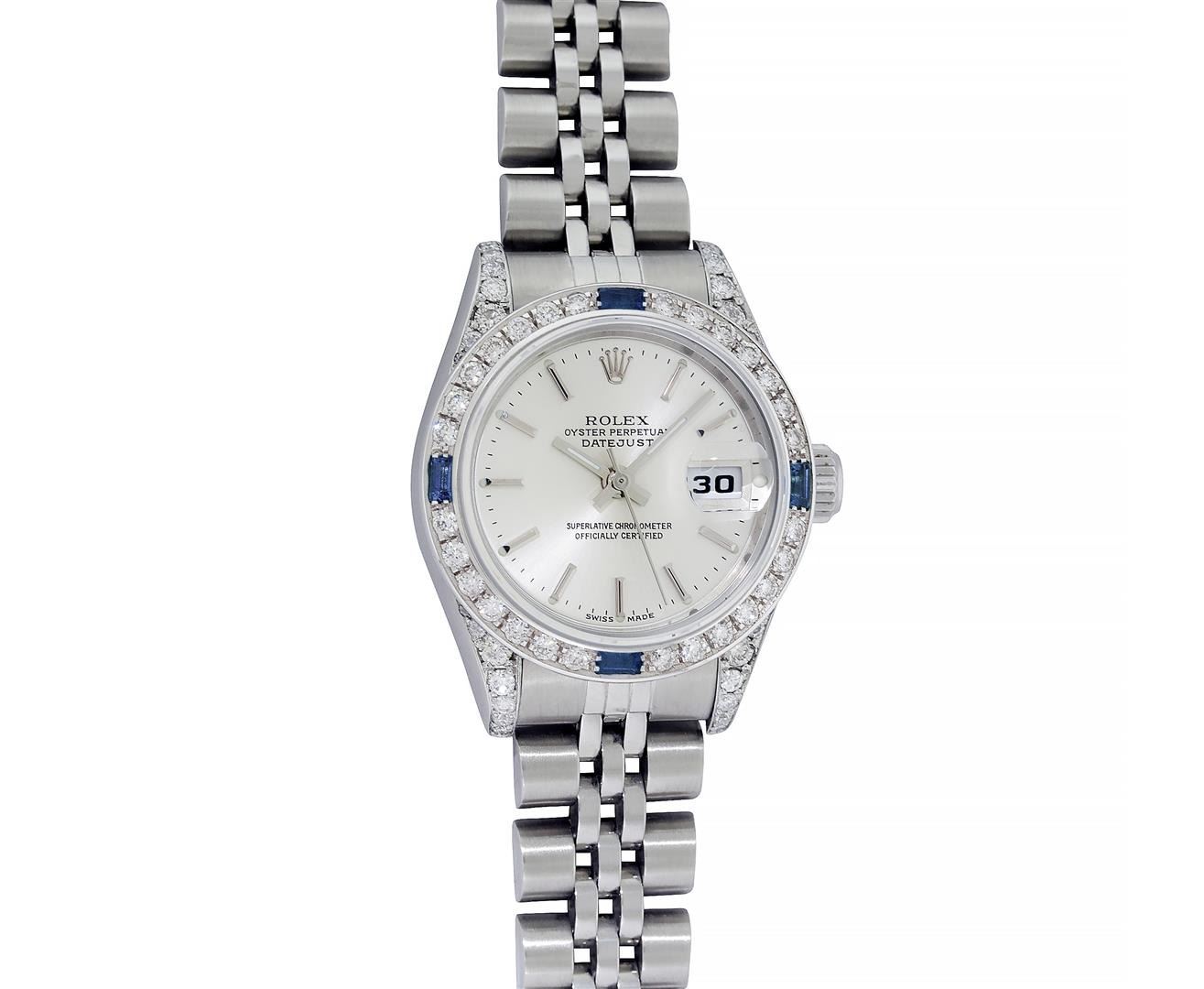 One Ladies Pre Owned Quickset Stainless Steel Rolex Datejust Polished Bright with Satin Finish, Serviced & Electronically Tested, Rolex Stainless Steel Case: 26mm, Custom Diamond Lugs: Added Diamonds On Lugs, Diamond Count: 24 Diamonds On Bezel, Color: G To H, Clartity: SI-VS. Rolex Stainless Steel Crown, Custom Bezel: New 18K White Gold Beadset And Sapphire Bezel, Stone Count: 28 Diamonds + 4 Sapphires, Diamond Color: G To H, Clarity: SI-VS. Custom Crystal: New Sapphire With Magnified Date Window. Custom Hands: New Lumi Hands. Rolex Movement: Quickset Automatic Winding Movement 2230. Rolex Dial: Silver Index With Dash Track And Lumi Dots. Date Window: 3 O'Clock Position Date Display, Model: Sapphire Quickset Datejust. Condition: G-6 Extra Fine. Rolex Bracelet: Stainless Steel Jubilee Band. Bright Polish & Satin Finish. 6.0 Inch Length, Adjustable. Standard Clasp, With Rolex Logo. This Watch Has Been Serviced Time Tested And Is In Excellent Condition It Is Free Of All Scratches And Dents.