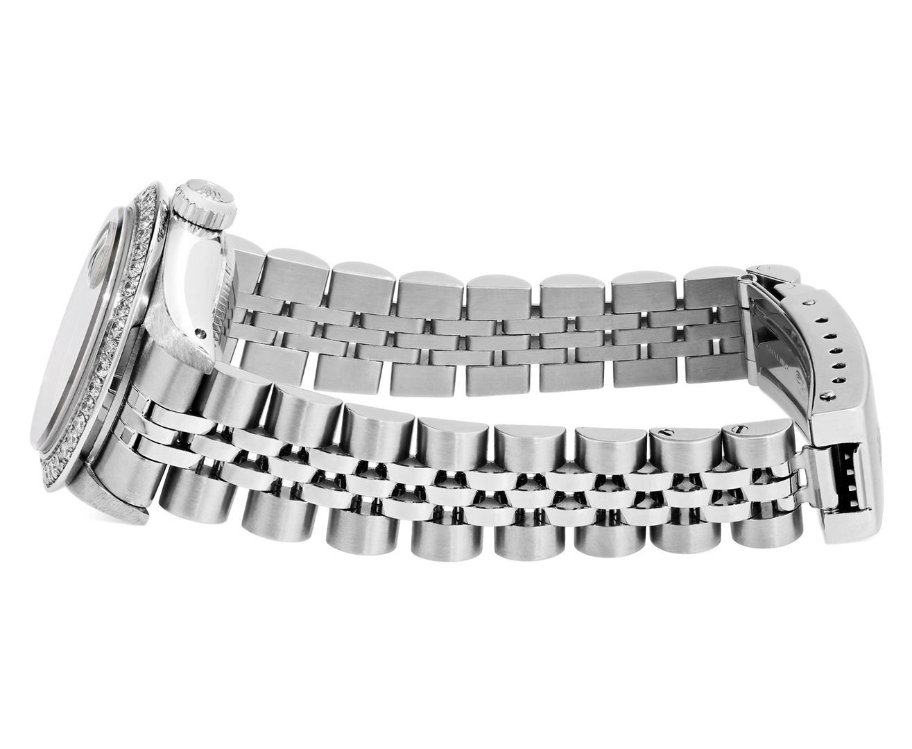 One Rolex Ladies Pre Owned Stainless Steel Date Wristwatch Polished Bright with Satin Finish, Serviced & Electronically Tested, Stainless Steel Case: 26mm, Stainless Steel Crown, Custom Bezel: New Stainless Steel Beadset Diamond Bezel, Diamond Count: 40 Diamonds On Bezel. Custom Crystal: New Sapphire With Magnified Date Window. Custom Hands: New Luminescent Hands. Rolex Movement: 2135 Automatic Winding Movement. Rolex Dial: Factory Silver Dial With Index Hour Markers And Lumi Dots. Date Window: 3 O'Clock Position Date Display, Model: Quickset Datejust. Condition: G-6 Extra Fine. Rolex Bracelet: Stainless Steel Jubilee Band. Bright Polish & Satin Finish. 6.0 Inch Length, Adjustable. Standard Clasp, With Rolex Logo. This Watch Has Been Serviced And Time Tested. It Is In Excellent Condition, Free Of All Scratches And Dents. This Watch Comes With A Rolex Box.