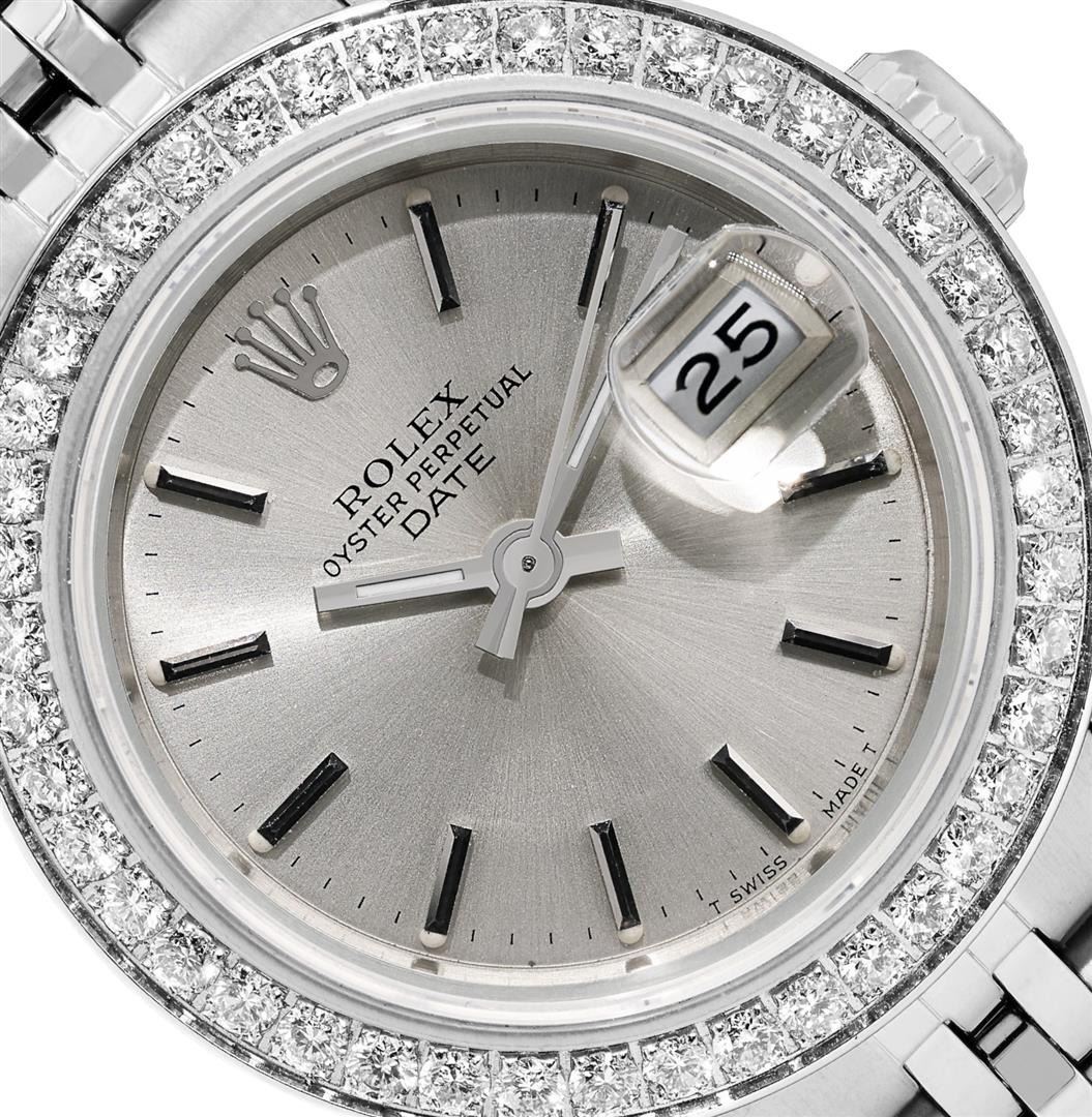 One Rolex Ladies Pre Owned Stainless Steel Date Wristwatch Polished Bright with Satin Finish, Serviced & Electronically Tested, Stainless Steel Case: 26mm, Stainless Steel Crown, Custom Bezel: New Stainless Steel Beadset Diamond Bezel, Diamond Count: 40 Diamonds On Bezel. Custom Crystal: New Sapphire With Magnified Date Window. Custom Hands: New Luminescent Hands. Rolex Movement: 2135 Automatic Winding Movement. Rolex Dial: Factory Silver Dial With Index Hour Markers And Lumi Dots. Date Window: 3 O'Clock Position Date Display, Model: Quickset Datejust. Condition: G-6 Extra Fine. Rolex Bracelet: Stainless Steel Jubilee Band. Bright Polish & Satin Finish. 6.0 Inch Length, Adjustable. Standard Clasp, With Rolex Logo. This Watch Has Been Serviced And Time Tested. It Is In Excellent Condition, Free Of All Scratches And Dents. This Watch Comes With A Rolex Box.
