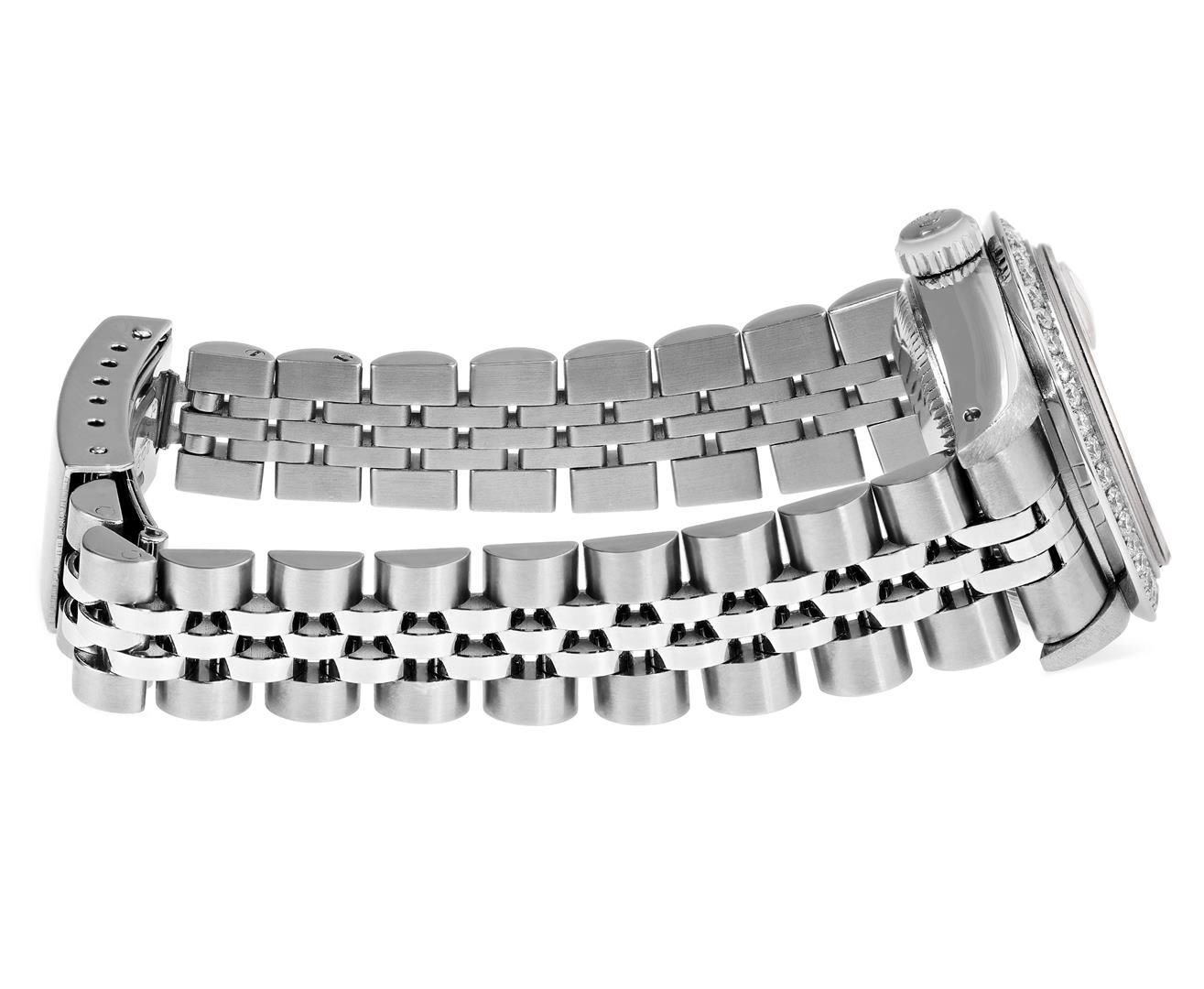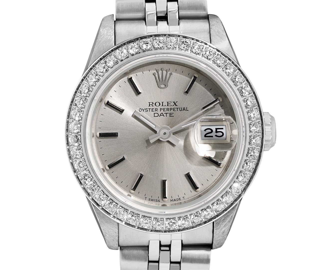 One Rolex Ladies Pre Owned Stainless Steel Date Wristwatch Polished Bright with Satin Finish, Serviced & Electronically Tested, Stainless Steel Case: 26mm, Stainless Steel Crown, Custom Bezel: New Stainless Steel Beadset Diamond Bezel, Diamond Count: 40 Diamonds On Bezel. Custom Crystal: New Sapphire With Magnified Date Window. Custom Hands: New Luminescent Hands. Rolex Movement: 2135 Automatic Winding Movement. Rolex Dial: Factory Silver Dial With Index Hour Markers And Lumi Dots. Date Window: 3 O'Clock Position Date Display, Model: Quickset Datejust. Condition: G-6 Extra Fine. Rolex Bracelet: Stainless Steel Jubilee Band. Bright Polish & Satin Finish. 6.0 Inch Length, Adjustable. Standard Clasp, With Rolex Logo. This Watch Has Been Serviced And Time Tested. It Is In Excellent Condition, Free Of All Scratches And Dents. This Watch Comes With A Rolex Box.