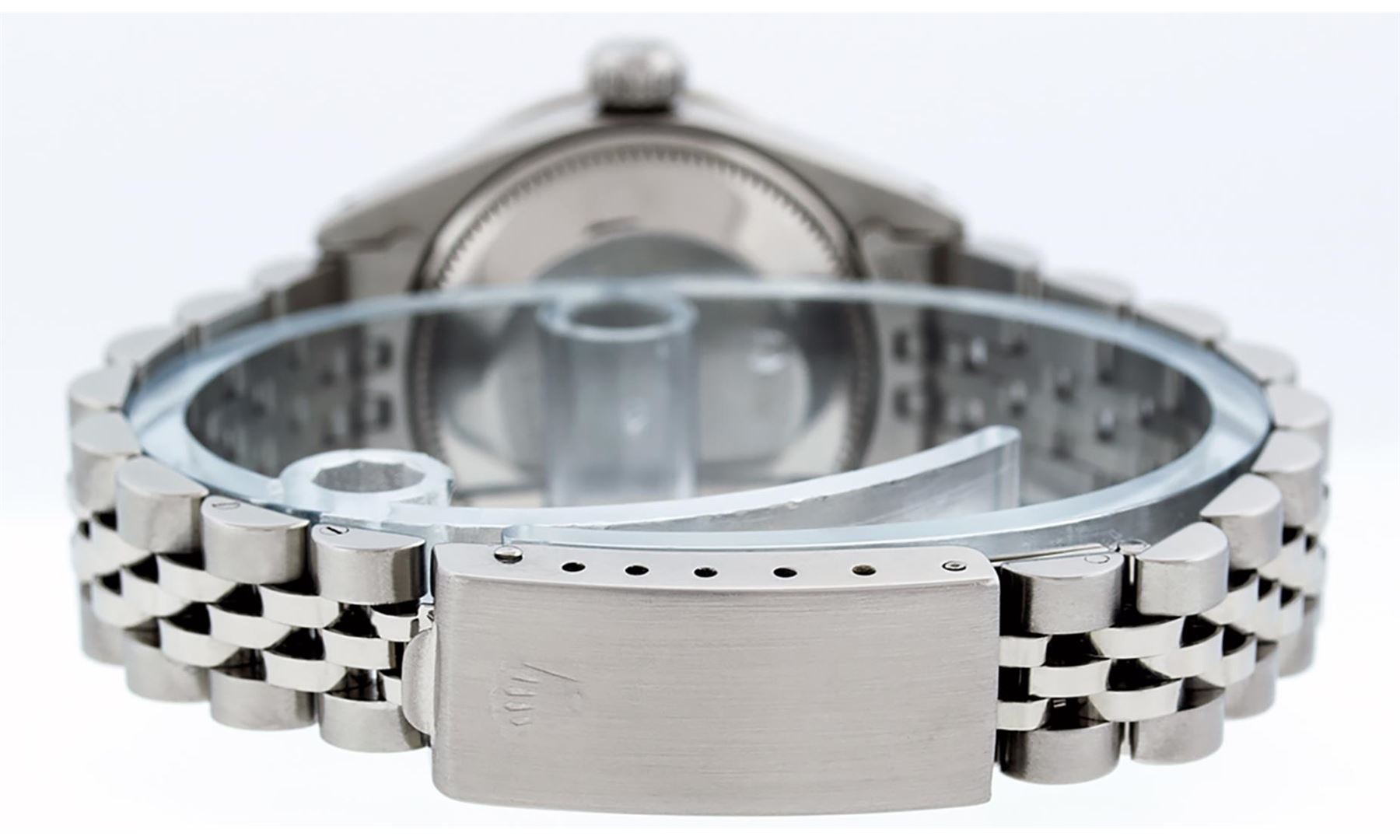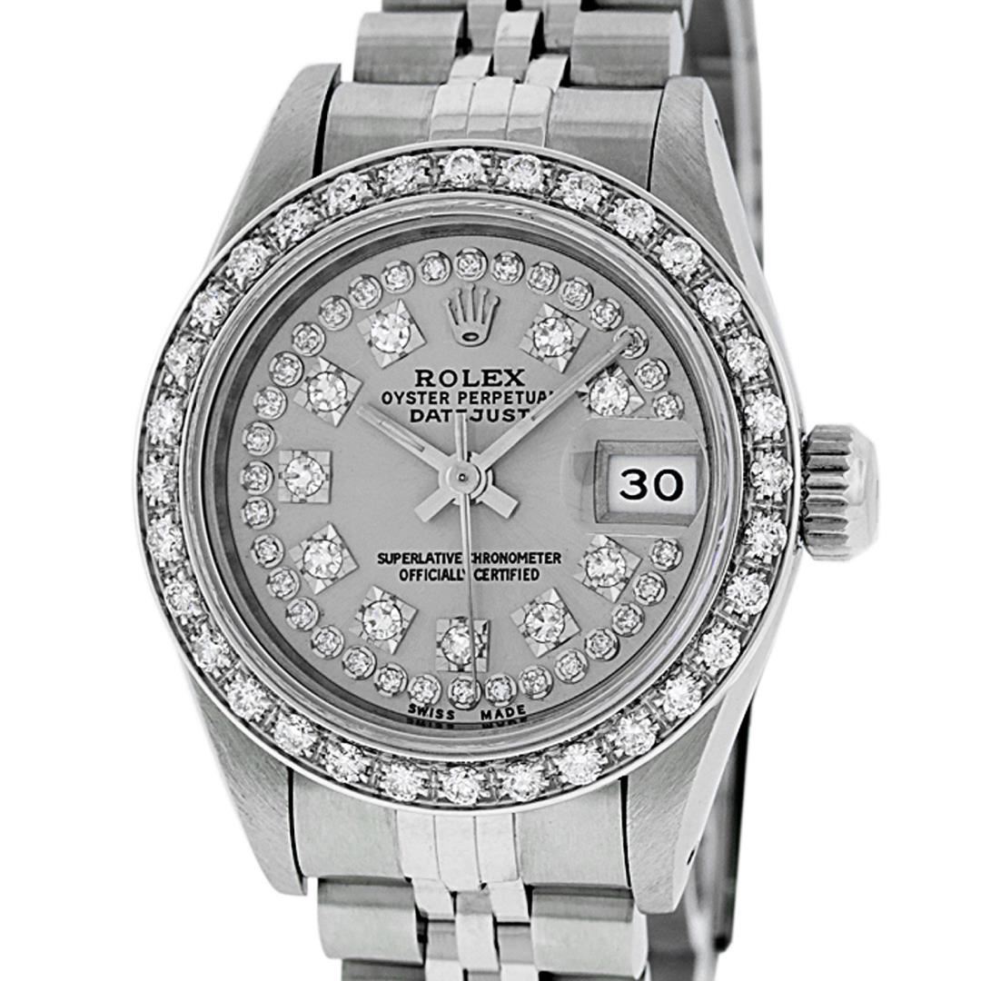 One Ladies Pre Owned Quickset Stainless Steel Rolex Datejust, Polished Bright with Satin Finish, Serviced And Electronically Tested, Stainless Steel Case: 26mm, Stainless Steel Crown. Custom Diamond Lugs: 24 Diamonds Added On Lugs. Custom Bezel: New 18K White Gold Beadset Diamond Bezel, Diamond Count: 32 Diamonds. Custom Crystal: New Sapphire With Magnified Date Window. Custom Hands: New Luminescent Hands. Rolex Movement: Automatic Winding Movement 2135. Custom Dial: Custom Slate Grey String Diamond Dial, Stone Count: 43 Diamonds On Dial. Date Window: 3 O'Clock Position Date Display, Model: Quickset Datejust. Condition: G-6 Extra Fine. Rolex Bracelet: Stainless Steel Jubilee Band. Bright Polish And Satin Finish. 6.0 Inch Length, Adjustable. Standard Clasp, With Rolex Logo. This Watch Has Been Serviced Time Tested And Is In Excellent Condition It Is Free Of All Scratches And Dents.