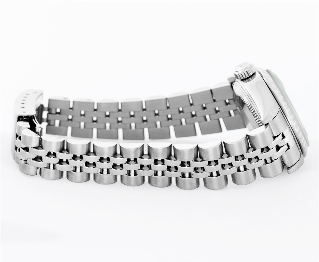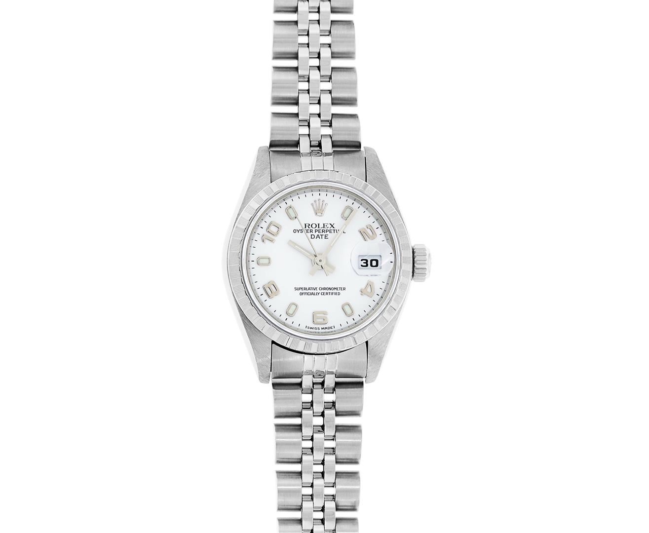 One Ladies Pre Owned Quickset Stainless Steel Rolex Date Polished Bright with Satin Finish, Serviced & Electronically Tested, Rolex Stainless Steel Case: 26mm. Rolex Stainless Steel Crown, Rolex Bezel: Stainless Steel Engine Turn Bezel. Crystal: Sapphire With Magnified Date Window. Hands: Lumi Hands. Rolex Movement: Quickset Automatic Winding Movement 2235. Rolex Dial: White Arabic With Dash Track. Date Window: 3 O'Clock Position Date Display, Model: Sapphire Quickset Datejust. Condition: G-6 Extra Fine. Rolex Bracelet: Stainless Steel Jubilee Band. Bright Polish & Satin Finish. 6.0 Inch Length, Adjustable. Standard Clasp, With Rolex Logo. This Watch Has Been Serviced Time Tested And Is In Excellent Condition It Is Free Of All Scratches And Dents.