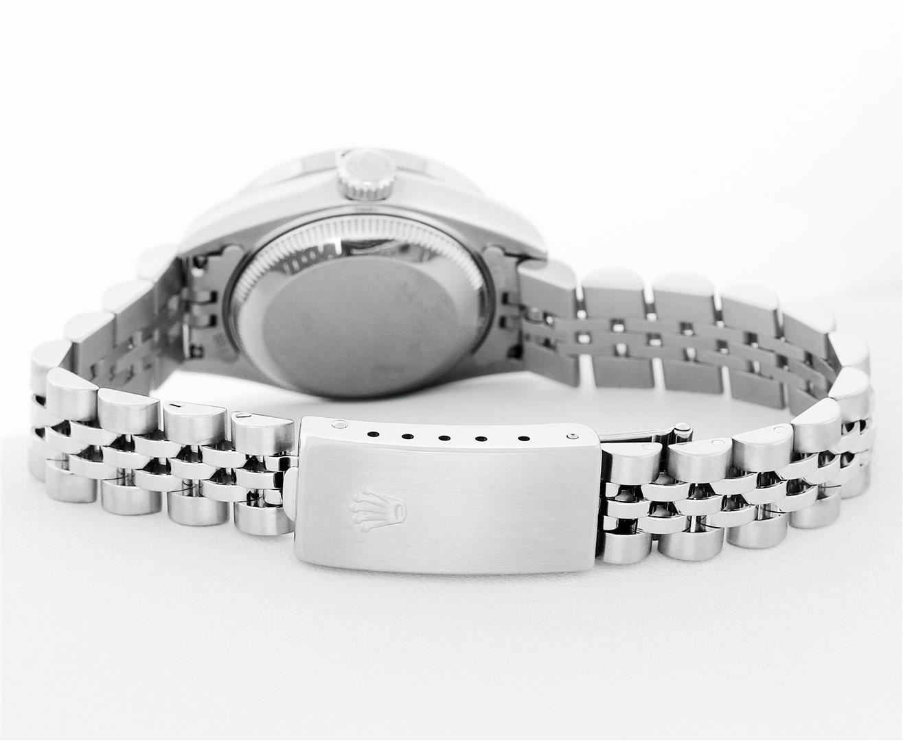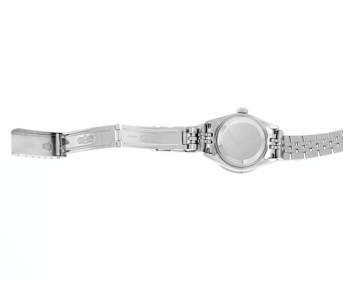 One Ladies Pre Owned Quickset Stainless Steel Rolex Date Polished Bright with Satin Finish, Serviced & Electronically Tested, Rolex Stainless Steel Case: 26mm. Rolex Stainless Steel Crown, Custom Bezel: New Stainless Steel Beadset Diamond Bezel, Stone Count: 32 Diamonds On Bezel, Diamond Color: G To H, Clarity: SI-VS. Custom Crystal: New Sapphire With Magnified Date Window. Custom Hands: New Lumi Hands. Rolex Movement: Quickset Automatic Winding Movement 2235. Rolex Dial: White Arabic With Dash Track. Date Window: 3 O'Clock Position Date Display, Model: Sapphire Quickset Datejust. Condition: G-6 Extra Fine. Rolex Bracelet: Stainless Steel Jubilee Band. Bright Polish & Satin Finish. 6.0 Inch Length, Adjustable. Standard Clasp, With Rolex Logo. This Watch Has Been Serviced Time Tested And Is In Excellent Condition It Is Free Of All Scratches And Dents.