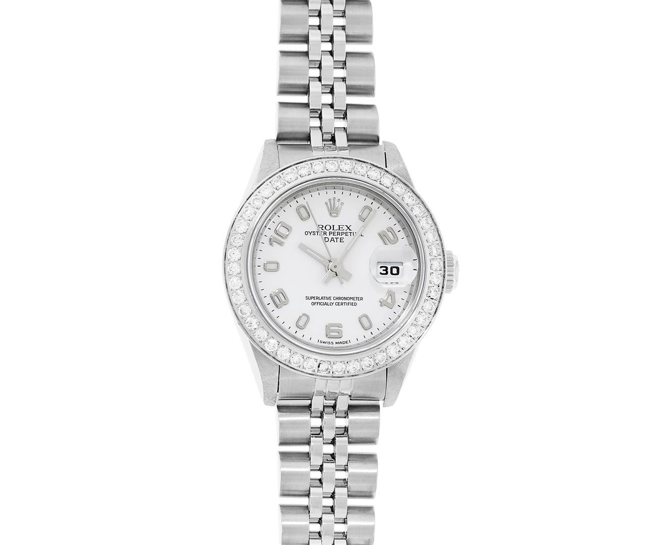 One Ladies Pre Owned Quickset Stainless Steel Rolex Date Polished Bright with Satin Finish, Serviced & Electronically Tested, Rolex Stainless Steel Case: 26mm. Rolex Stainless Steel Crown, Custom Bezel: New Stainless Steel Beadset Diamond Bezel, Stone Count: 32 Diamonds On Bezel, Diamond Color: G To H, Clarity: SI-VS. Custom Crystal: New Sapphire With Magnified Date Window. Custom Hands: New Lumi Hands. Rolex Movement: Quickset Automatic Winding Movement 2235. Rolex Dial: White Arabic With Dash Track. Date Window: 3 O'Clock Position Date Display, Model: Sapphire Quickset Datejust. Condition: G-6 Extra Fine. Rolex Bracelet: Stainless Steel Jubilee Band. Bright Polish & Satin Finish. 6.0 Inch Length, Adjustable. Standard Clasp, With Rolex Logo. This Watch Has Been Serviced Time Tested And Is In Excellent Condition It Is Free Of All Scratches And Dents.