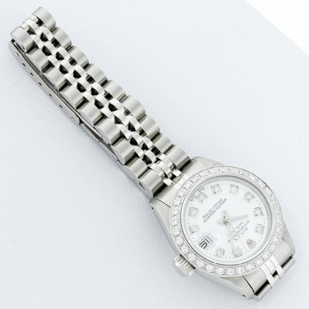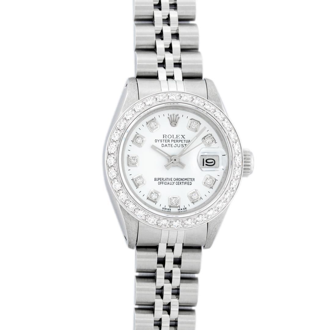 One Ladies Pre Owned Quickset Rolex Stainless Steel Wristwatch Polished Bright with Satin Finish, Serviced And Electronically Tested, Stainless Steel Case: 26mm, Stainless Steel Crown, Custom Bezel: New 18K White Gold Beadset Diamond Bezel, Diamond Count: 32 Diamonds. Custom Crystal: New Sapphire With Date Window. Custom Hands: New Luminescent Hands. Rolex Movement: Automatic Winding Movement 2135. Custom Dial: Custom White Dial With Added Diamonds, Diamond Count: 10 Diamonds On Dial. Date Window: 3 O'Clock Position Date Display, Model: Datejust. Condition: G-6 Extra Fine. Rolex Bracelet: Stainless Steel Jubilee Band. Bright Polish And Satin Finish. 6.0 Inch Length, Adjustable. Standard Clasp, With Rolex Logo. This Watch Has Been Serviced Time Tested And Is In Excellent Condition It Is Free Of All Scratches And Dents.