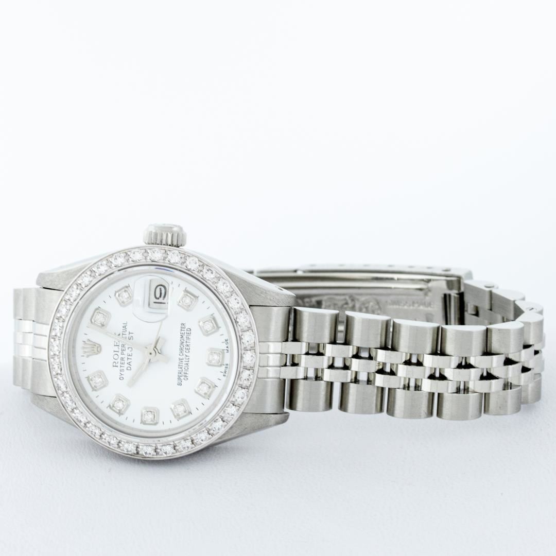 One Ladies Pre Owned Quickset Rolex Stainless Steel Wristwatch Polished Bright with Satin Finish, Serviced And Electronically Tested, Stainless Steel Case: 26mm, Stainless Steel Crown, Custom Bezel: New 18K White Gold Beadset Diamond Bezel, Diamond Count: 32 Diamonds. Custom Crystal: New Sapphire With Date Window. Custom Hands: New Luminescent Hands. Rolex Movement: Automatic Winding Movement 2135. Custom Dial: Custom White Dial With Added Diamonds, Diamond Count: 10 Diamonds On Dial. Date Window: 3 O'Clock Position Date Display, Model: Datejust. Condition: G-6 Extra Fine. Rolex Bracelet: Stainless Steel Jubilee Band. Bright Polish And Satin Finish. 6.0 Inch Length, Adjustable. Standard Clasp, With Rolex Logo. This Watch Has Been Serviced Time Tested And Is In Excellent Condition It Is Free Of All Scratches And Dents.