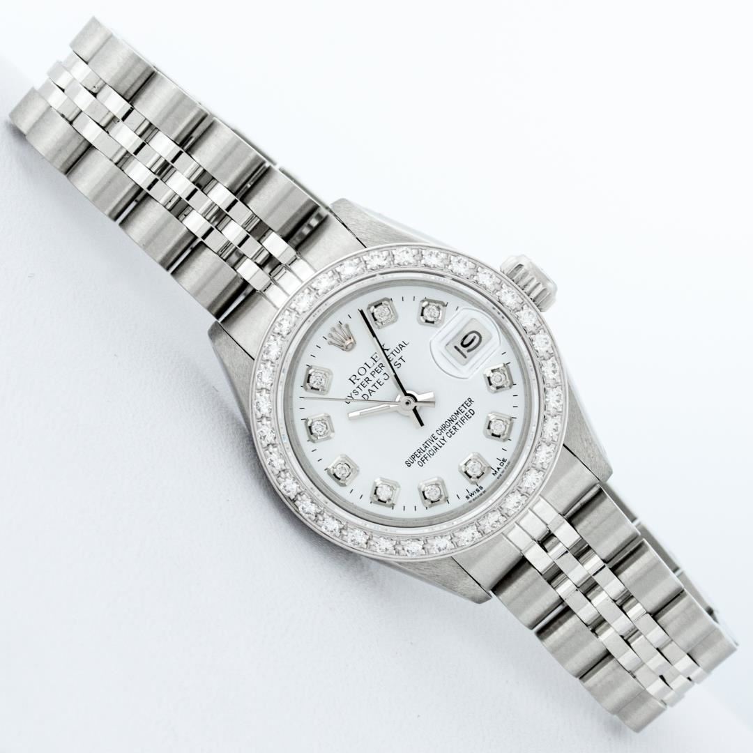 One Ladies Pre Owned Quickset Rolex Stainless Steel Wristwatch Polished Bright with Satin Finish, Serviced And Electronically Tested, Stainless Steel Case: 26mm, Stainless Steel Crown, Custom Bezel: New 18K White Gold Beadset Diamond Bezel, Diamond Count: 32 Diamonds. Custom Crystal: New Sapphire With Date Window. Custom Hands: New Luminescent Hands. Rolex Movement: Automatic Winding Movement 2135. Custom Dial: Custom White Dial With Added Diamonds, Diamond Count: 10 Diamonds On Dial. Date Window: 3 O'Clock Position Date Display, Model: Datejust. Condition: G-6 Extra Fine. Rolex Bracelet: Stainless Steel Jubilee Band. Bright Polish And Satin Finish. 6.0 Inch Length, Adjustable. Standard Clasp, With Rolex Logo. This Watch Has Been Serviced Time Tested And Is In Excellent Condition It Is Free Of All Scratches And Dents.
