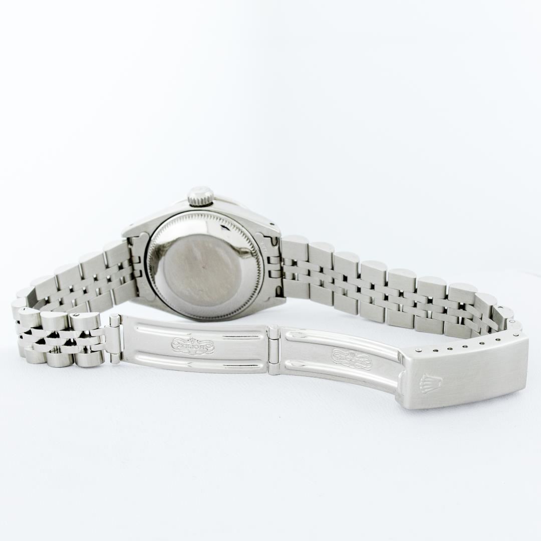 One Ladies Pre Owned Quickset Rolex Stainless Steel Wristwatch Polished Bright with Satin Finish, Serviced And Electronically Tested, Stainless Steel Case: 26mm, Stainless Steel Crown, Custom Bezel: New 18K White Gold Beadset Diamond Bezel, Diamond Count: 32 Diamonds. Custom Crystal: New Sapphire With Date Window. Custom Hands: New Luminescent Hands. Rolex Movement: Automatic Winding Movement 2135. Custom Dial: Custom White Dial With Added Diamonds, Diamond Count: 10 Diamonds On Dial. Date Window: 3 O'Clock Position Date Display, Model: Datejust. Condition: G-6 Extra Fine. Rolex Bracelet: Stainless Steel Jubilee Band. Bright Polish And Satin Finish. 6.0 Inch Length, Adjustable. Standard Clasp, With Rolex Logo. This Watch Has Been Serviced Time Tested And Is In Excellent Condition It Is Free Of All Scratches And Dents.