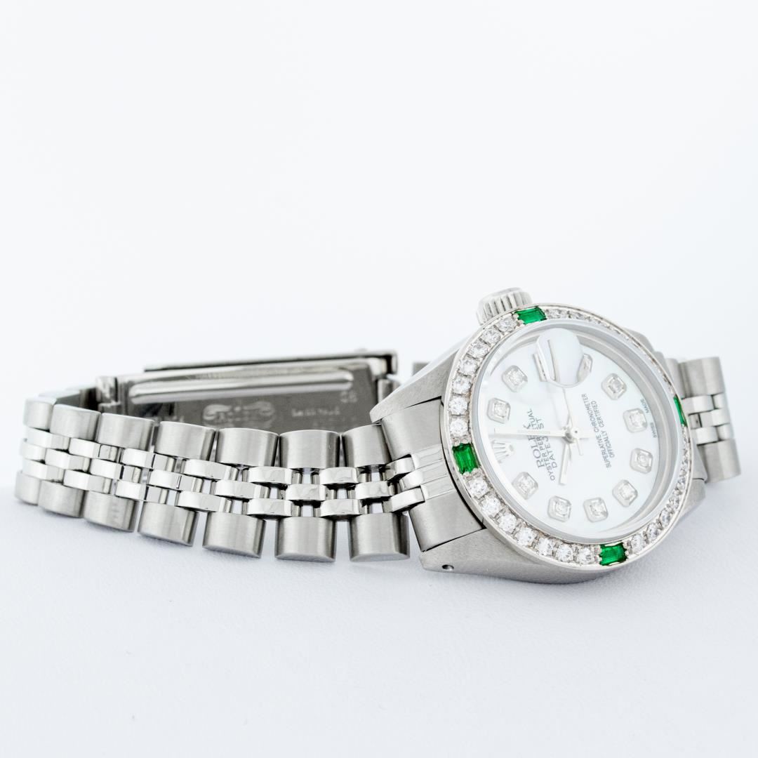 One Ladies Pre Owned Quickset Stainless Steel Rolex Datejust Polished Bright with Satin Finish, Serviced And Electronically Tested, Stainless Steel Case: 26mm, Stainless Steel Crown, Custom Bezel: New 18K White Gold Emerald Beadset Diamond Bezel, Diamond + Gem Count: 28 Diamonds + 4 Emeralds. Custom Crystal: New Sapphire With Date Window. Custom Hands: New Luminescent Hands. Rolex Movement: Automatic Winding Movement 2135. Custom Dial: Custom White Dial With Added Diamond Hour Markers, 10 Diamond On Dial. Date Window: 3 O'Clock Position Date Display, Model: Quickset Datejust. Condition: G-6 Extra Fine. Rolex Bracelet: Stainless Steel Jubilee Band. Bright Polish And Satin Finish. 6.0 Inch Length, Adjustable. Standard Clasp, With Rolex Logo. This Watch Has Been Serviced Time Tested And Is In Excellent Condition It Is Free Of All Scratches And Dents.