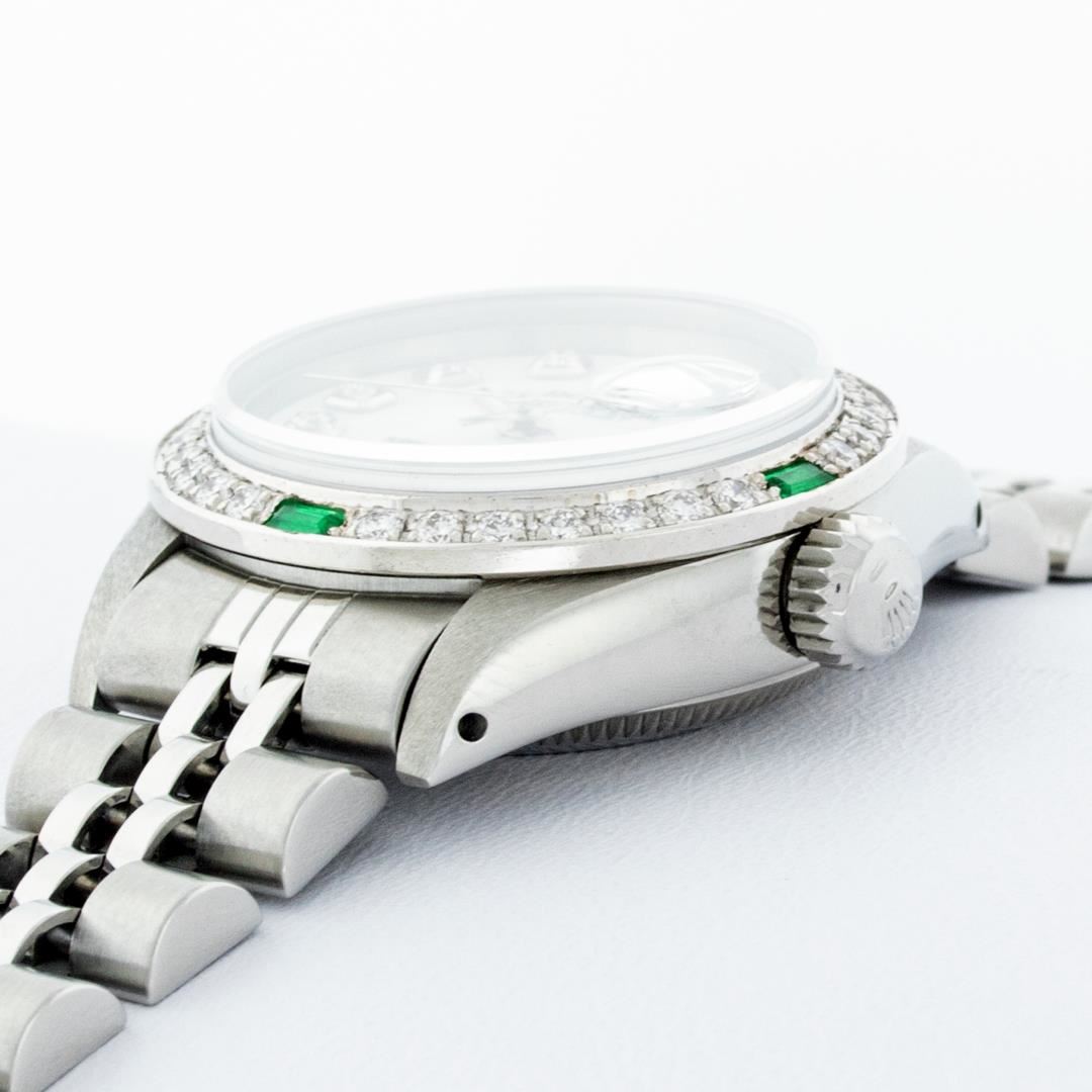One Ladies Pre Owned Quickset Stainless Steel Rolex Datejust Polished Bright with Satin Finish, Serviced And Electronically Tested, Stainless Steel Case: 26mm, Stainless Steel Crown, Custom Bezel: New 18K White Gold Emerald Beadset Diamond Bezel, Diamond + Gem Count: 28 Diamonds + 4 Emeralds. Custom Crystal: New Sapphire With Date Window. Custom Hands: New Luminescent Hands. Rolex Movement: Automatic Winding Movement 2135. Custom Dial: Custom White Dial With Added Diamond Hour Markers, 10 Diamond On Dial. Date Window: 3 O'Clock Position Date Display, Model: Quickset Datejust. Condition: G-6 Extra Fine. Rolex Bracelet: Stainless Steel Jubilee Band. Bright Polish And Satin Finish. 6.0 Inch Length, Adjustable. Standard Clasp, With Rolex Logo. This Watch Has Been Serviced Time Tested And Is In Excellent Condition It Is Free Of All Scratches And Dents.