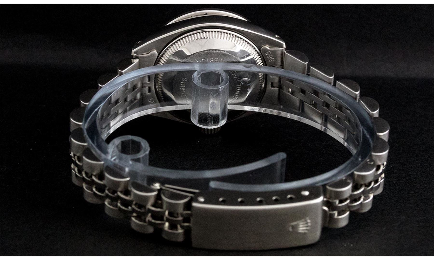 One Ladies Pre Owned Quickset Stainless Steel Rolex Datejust Polished Bright with Satin Finish, Serviced And Electronically Tested, Stainless Steel Case: 26mm, Stainless Steel Crown, Custom Bezel: New 18K White Gold Sapphire Beadset Diamond Bezel, Diamond + Gem Count: 28 Diamonds + 4 Sapphires. Custom Crystal: New Sapphire With Date Window. Custom Hands: New Luminescent Hands. Rolex Movement: Automatic Winding Movement 2135. Custom Dial: White Dial With Added Diamond Hour Markers, 10 Diamond On Dial. Date Window: 3 O'Clock Position Date Display, Model: Quickset Datejust. Condition: G-6 Extra Fine. Rolex Bracelet: Stainless Steel Jubilee Band. Bright Polish And Satin Finish. 6.0 Inch Length, Adjustable. Standard Clasp, With Rolex Logo. This Watch Has Been Serviced Time Tested And Is In Excellent Condition It Is Free Of All Scratches And Dents.