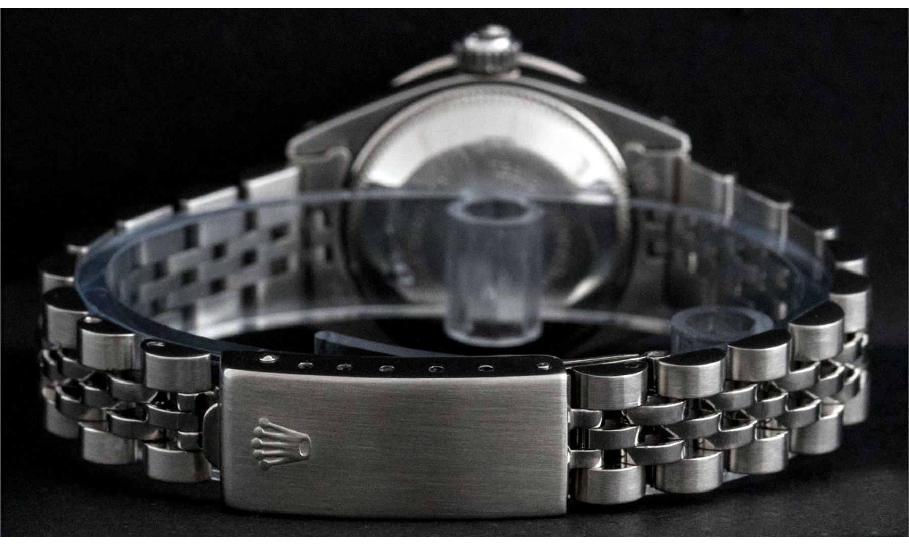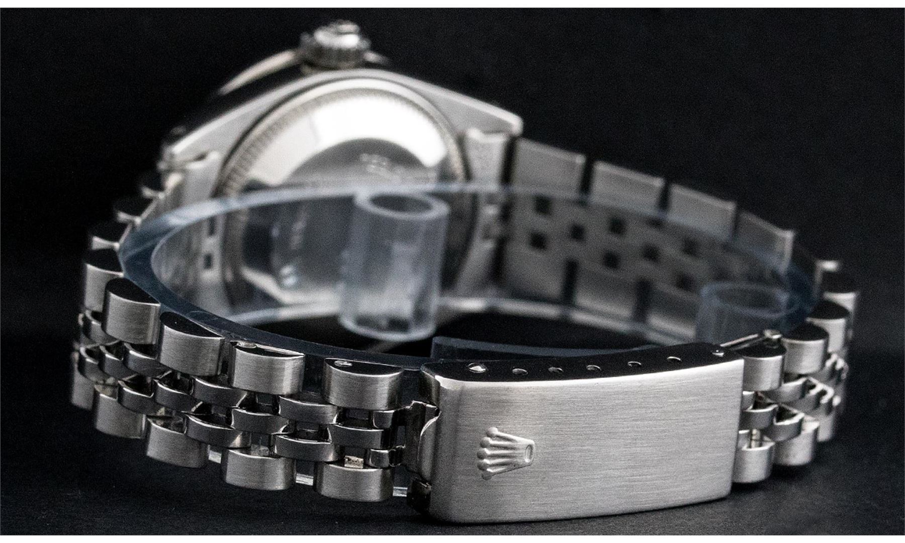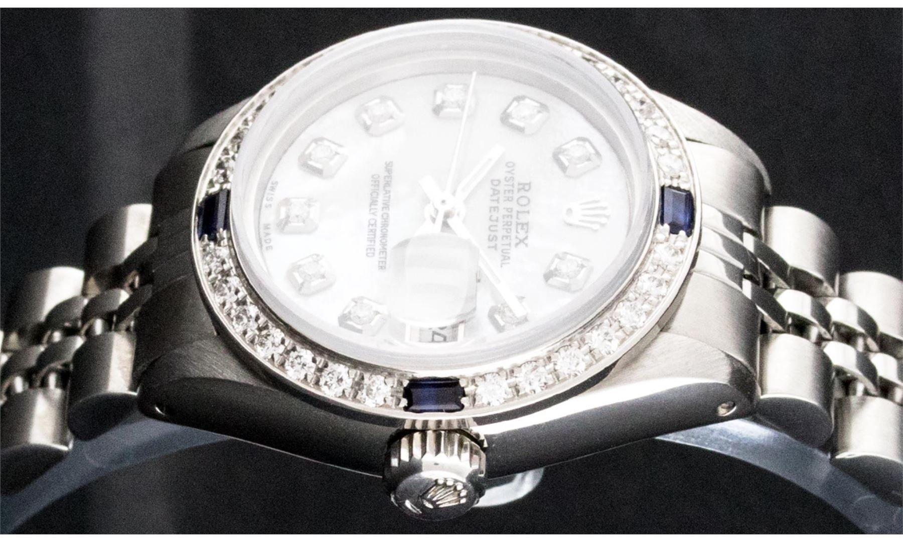 One Ladies Pre Owned Quickset Stainless Steel Rolex Datejust Polished Bright with Satin Finish, Serviced And Electronically Tested, Stainless Steel Case: 26mm, Stainless Steel Crown, Custom Bezel: New 18K White Gold Sapphire Beadset Diamond Bezel, Diamond + Gem Count: 28 Diamonds + 4 Sapphires. Custom Crystal: New Sapphire With Date Window. Custom Hands: New Luminescent Hands. Rolex Movement: Automatic Winding Movement 2135. Custom Dial: White Dial With Added Diamond Hour Markers, 10 Diamond On Dial. Date Window: 3 O'Clock Position Date Display, Model: Quickset Datejust. Condition: G-6 Extra Fine. Rolex Bracelet: Stainless Steel Jubilee Band. Bright Polish And Satin Finish. 6.0 Inch Length, Adjustable. Standard Clasp, With Rolex Logo. This Watch Has Been Serviced Time Tested And Is In Excellent Condition It Is Free Of All Scratches And Dents.