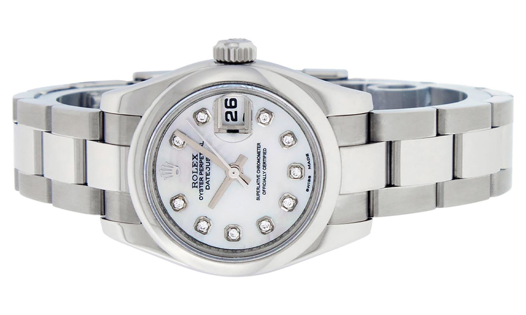 One Ladies Pre Owned Quickset Stainless Steel Rolex Datejust Polished Bright with Satin Finish, Serviced And Electronically Tested, Rolex Stainless Steel Case: 26mm, Rolex Stainless Steel Crown, Rolex Bezel: Stainless Steel Smooth Bezel. Rolex Crystal: Sapphire With Magnified Date Window. Rolex Hands: Luminescent Hands. Rolex Movement: Automatic Winding Movement 22535. Custom Dial: Custom White With Added Diamonds, Diamond Count: 10 Single Cut Diamonds On Dial. Date Window: 3 O'Clock Position Date Display, Model: Quickset Datejust. Condition: G-6 Extra Fine. Rolex Bracelet: Stainless Steel Oyster Band. Bright Polish And Satin Finish. 6.0 Inch Length, Adjustable. Standard Clasp, With Rolex Logo. This Watch Has Been Serviced Time Tested And Is In Excellent Condition It Is Free Of All Scratches And Dents.