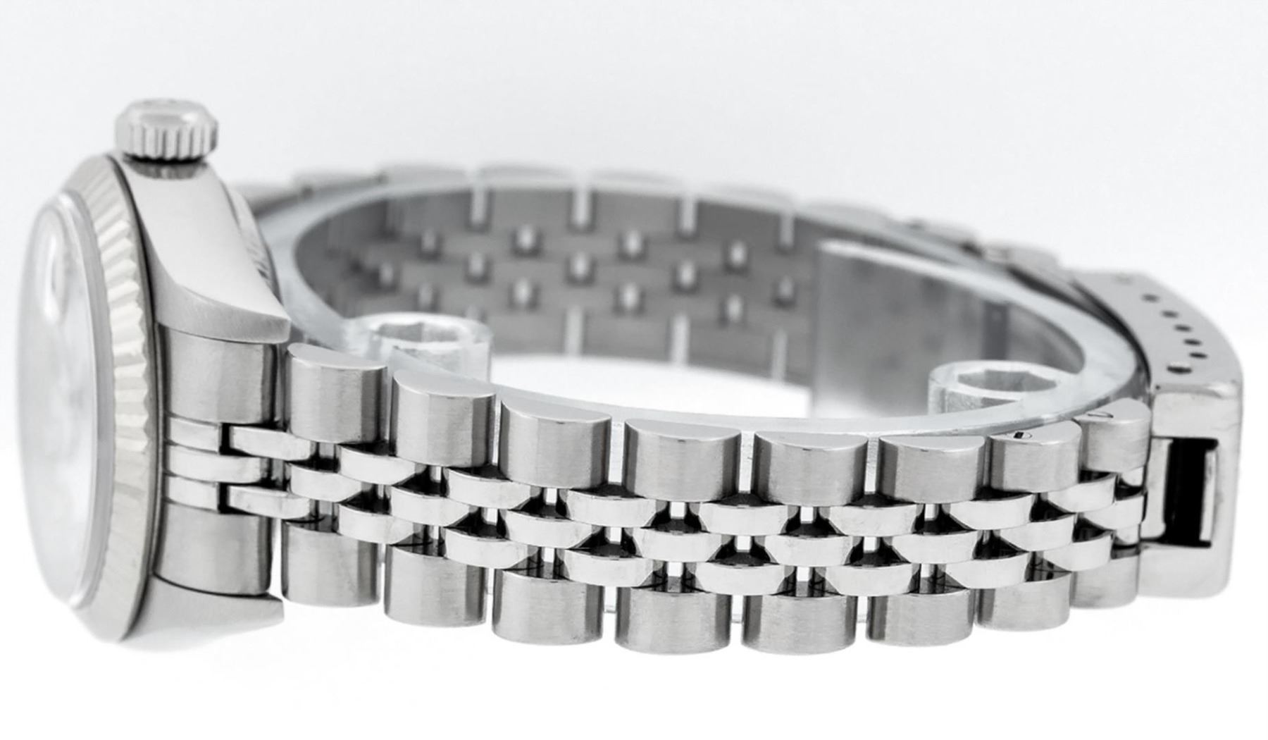 One Ladies Pre Owned Quickset Stainless Steel Rolex Datejust Polished Bright with Satin Finish, Serviced And Electronically Tested, Rolex Stainless Steel Case: 26mm, Rolex Stainless Steel Crown, Rolex Bezel: 18K White Gold Fluted Bezel. Custom Crystal: New Sapphire With Date Window. Custom Hands: New Luminescent Hands. Rolex Movement: Automatic Winding Movement 2235. Custom Dial: White Diamond Dial With Added Diamonds, Diamond Count: 10 Diamonds On Dial. Date Window: 3 O'Clock Position Date Display, Model: Quickset Datejust. Condition: G-6 Extra Fine. Rolex Bracelet: Stainless Steel Jubilee Band. Bright Polish And Satin Finish. 6.0 Inch Length, Adjustable. Standard Clasp, With Rolex Logo. This Watch Has Been Serviced Time Tested And Is In Excellent Condition It Is Free Of All Scratches And Dents.