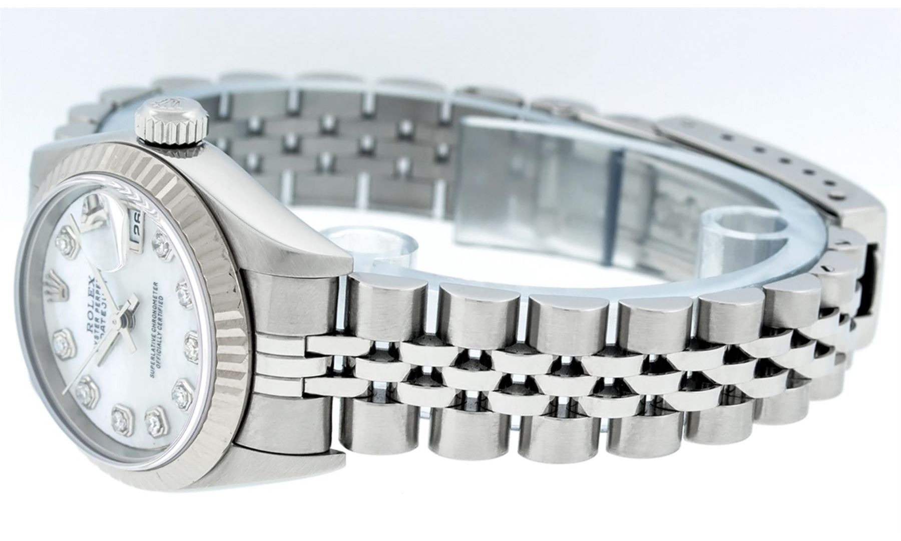 One Ladies Pre Owned Quickset Stainless Steel Rolex Datejust Polished Bright with Satin Finish, Serviced And Electronically Tested, Rolex Stainless Steel Case: 26mm, Rolex Stainless Steel Crown, Rolex Bezel: 18K White Gold Fluted Bezel. Custom Crystal: New Sapphire With Date Window. Custom Hands: New Luminescent Hands. Rolex Movement: Automatic Winding Movement 2235. Custom Dial: White Diamond Dial With Added Diamonds, Diamond Count: 10 Diamonds On Dial. Date Window: 3 O'Clock Position Date Display, Model: Quickset Datejust. Condition: G-6 Extra Fine. Rolex Bracelet: Stainless Steel Jubilee Band. Bright Polish And Satin Finish. 6.0 Inch Length, Adjustable. Standard Clasp, With Rolex Logo. This Watch Has Been Serviced Time Tested And Is In Excellent Condition It Is Free Of All Scratches And Dents.