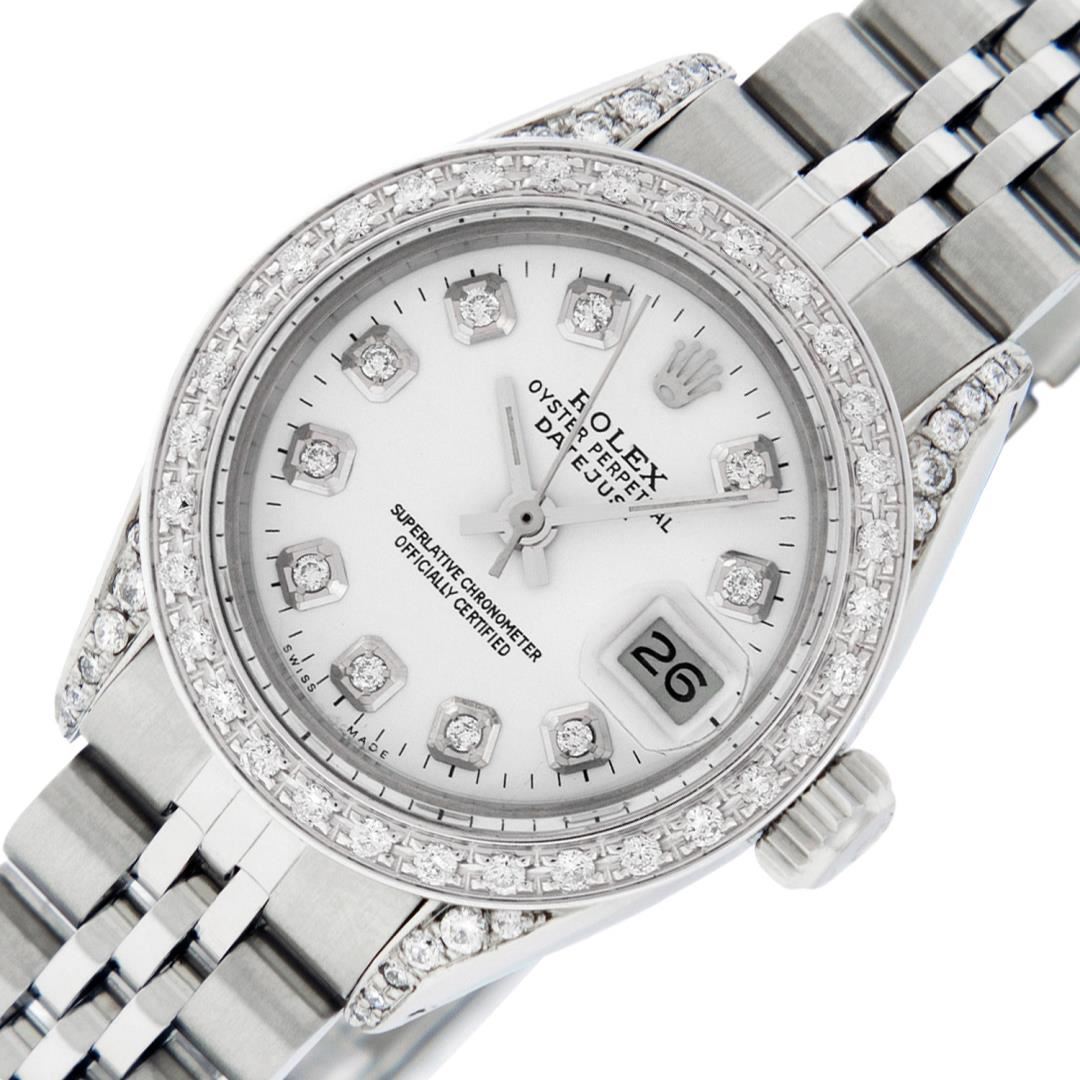 One Ladies Pre Owned Quickset Stainless Steel Rolex Datejust Polished Bright with Satin Finish, Serviced And Electronically Tested, Stainless Steel Case: 26mm, Stainless Steel Crown, Custom Diamond Lugs: 24 Diamonds Added On Lugs. Custom Bezel: New 18K Wh