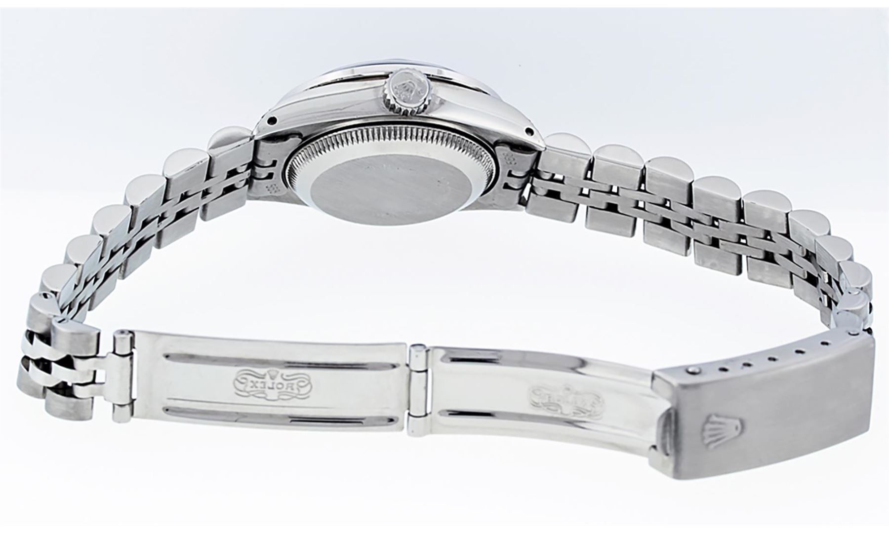 One Ladies Pre Owned Quickset Stainless Steel Rolex Datejust Polished Bright with Satin Finish, Serviced And Electronically Tested, Stainless Steel Case: 26mm, Stainless Steel Crown, Custom Diamond Lugs: 24 Diamonds Added On Lugs. Custom Bezel: New 18K White Gold Diamond Beadset Bezel, Diamond Count: 32 Diamonds. Custom Crystal: New Sapphire With Date Window. Custom Hands: New Luminescent Hands. Rolex Movement: Automatic Winding Movement 2135. Custom Dial: Custom White Dial With Added Diamonds, 10 Diamonds On Dial. Date Window: 3 O'Clock Position Date Display, Model: Quickset Datejust. Condition: G-6 Extra Fine. Rolex Bracelet: Stainless Steel Jubilee Band. Bright Polish And Satin Finish. 6.0 Inch Length, Adjustable. Standard Clasp, With Rolex Logo. This Watch Has Been Serviced Time Tested And Is In Excellent Condition It Is Free Of All Scratches And Dents.