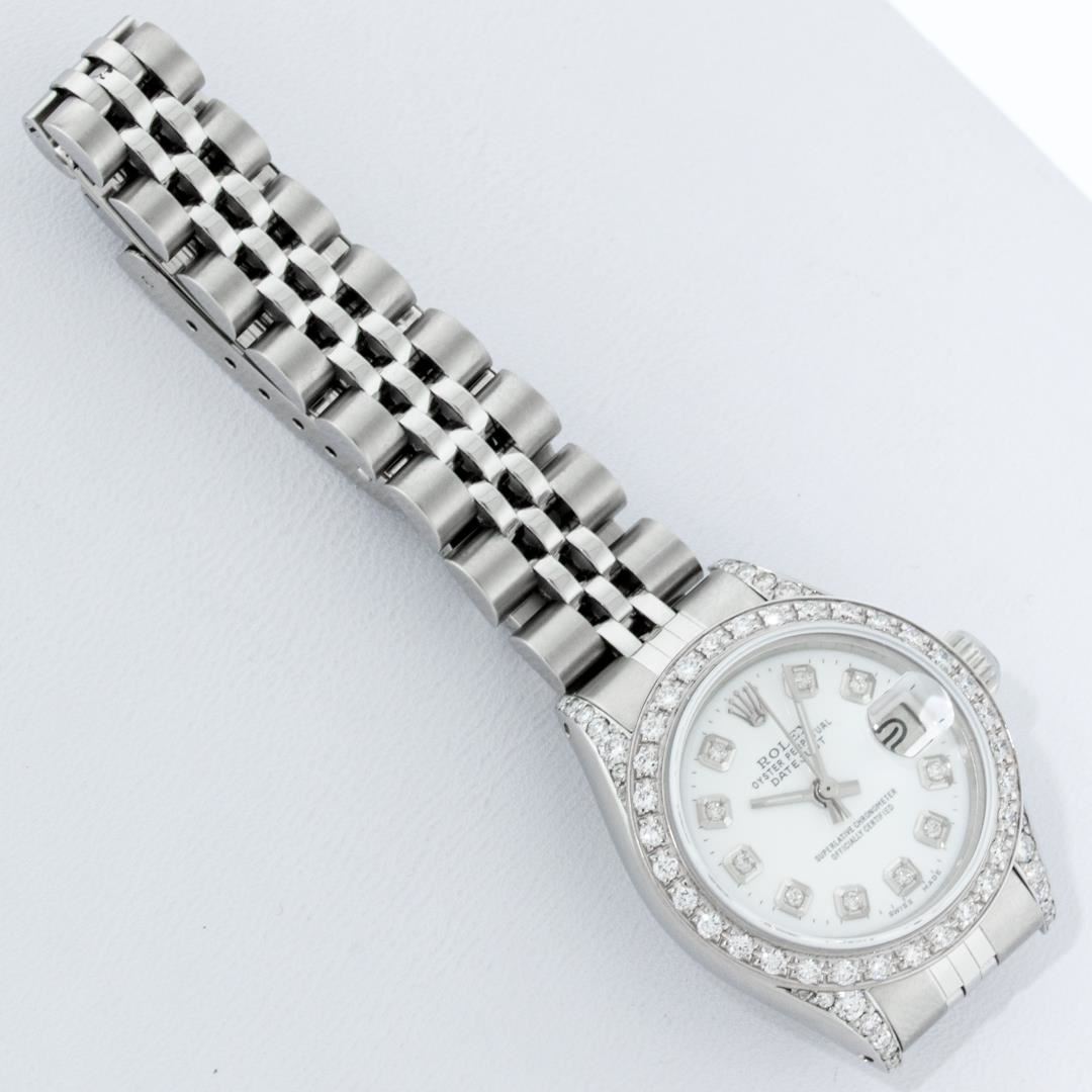 One Ladies Pre Owned Quickset Stainless Steel Rolex Datejust Polished Bright with Satin Finish, Serviced And Electronically Tested, Stainless Steel Case: 26mm, Stainless Steel Crown, Custom Diamond Lugs: 24 Diamonds Added On Lugs. Custom Bezel: New 18K White Gold Diamond Beadset Bezel, Diamond Count: 32 Diamonds. Custom Crystal: New Sapphire With Date Window. Custom Hands: New Luminescent Hands. Rolex Movement: Automatic Winding Movement 2135. Custom Dial: Custom White Dial With Added Diamonds, 10 Diamonds On Dial. Date Window: 3 O'Clock Position Date Display, Model: Quickset Datejust. Condition: G-6 Extra Fine. Rolex Bracelet: Stainless Steel Jubilee Band. Bright Polish And Satin Finish. 6.0 Inch Length, Adjustable. Standard Clasp, With Rolex Logo. This Watch Has Been Serviced Time Tested And Is In Excellent Condition It Is Free Of All Scratches And Dents.