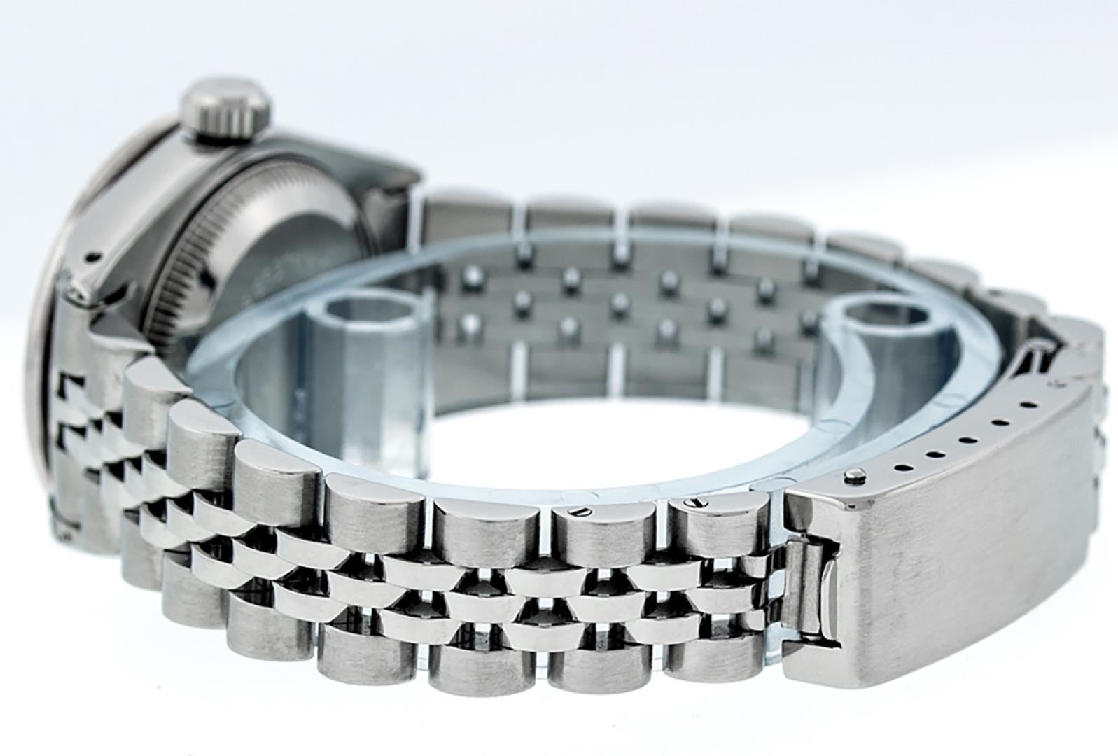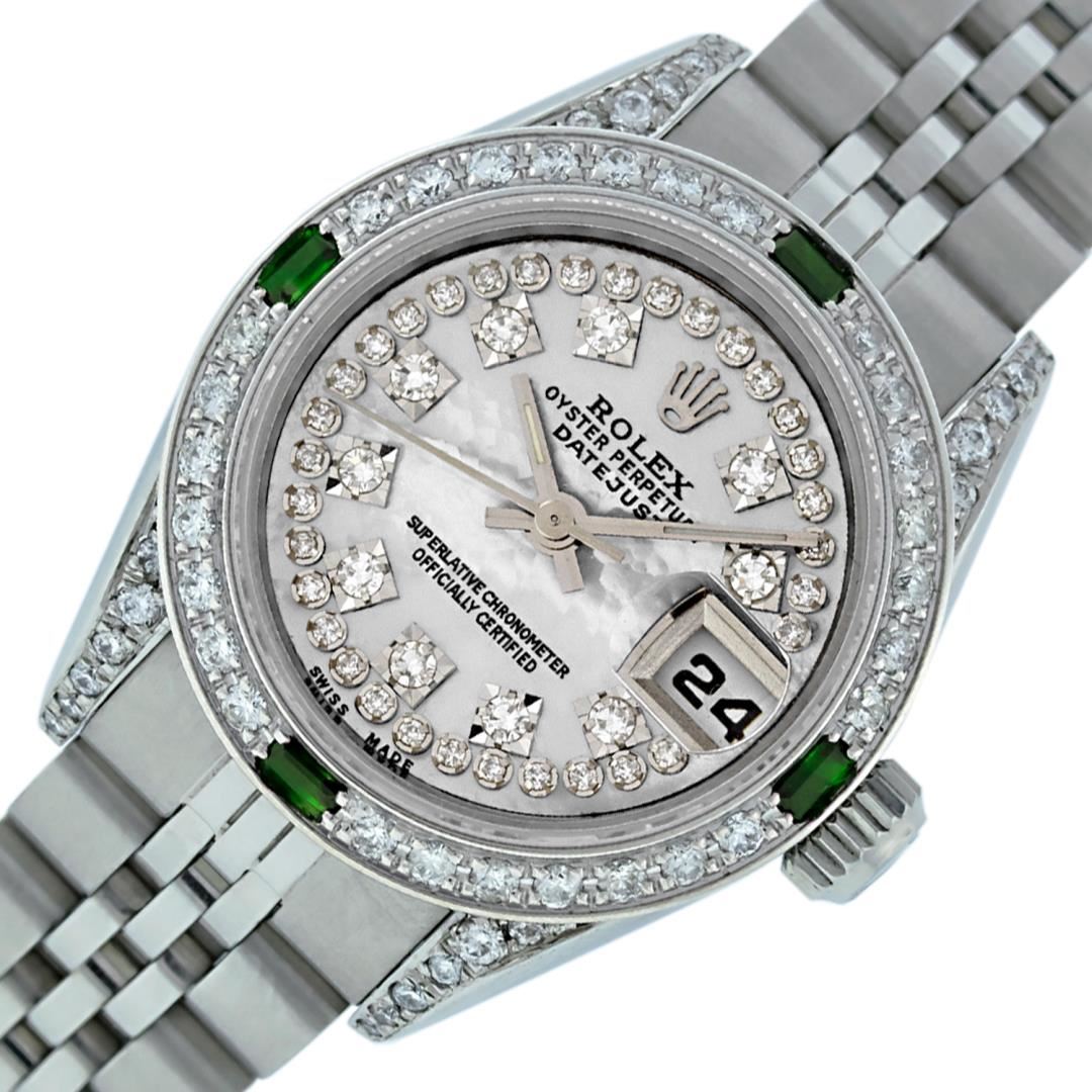 One Ladies Pre Owned Quickset Stainless Steel Rolex Datejust Polished Bright with Satin Finish, Serviced And Electronically Tested, Stainless Steel Case: 26mm, Stainless Steel Crown, Custom Diamond Lugs: 24 Added Diamonds On Lugs. Custom Bezel: New 18K White Gold Emerald Beadset Bezel, Diamond Count: 28 Diamonds + 4 Emeralds. Custom Crystal: New Sapphire With Date Window. Custom Hands: New Luminescent Hands. Rolex Movement: Automatic Winding Movement 2135. Custom Dial: Custom White String Dial With Added Diamonds, 43 Diamonds On Dial. Date Window: 3 O'Clock Position Date Display, Model: Datejust. Condition: G-6 Extra Fine. Rolex Bracelet: Stainless Steel Jubilee Band. Bright Polish And Satin Finish. 6.0 Inch Length, Adjustable. Standard Clasp, With Rolex Logo. This Watch Has Been Serviced Time Tested And Is In Excellent Condition It Is Free Of All Scratches And Dents.
