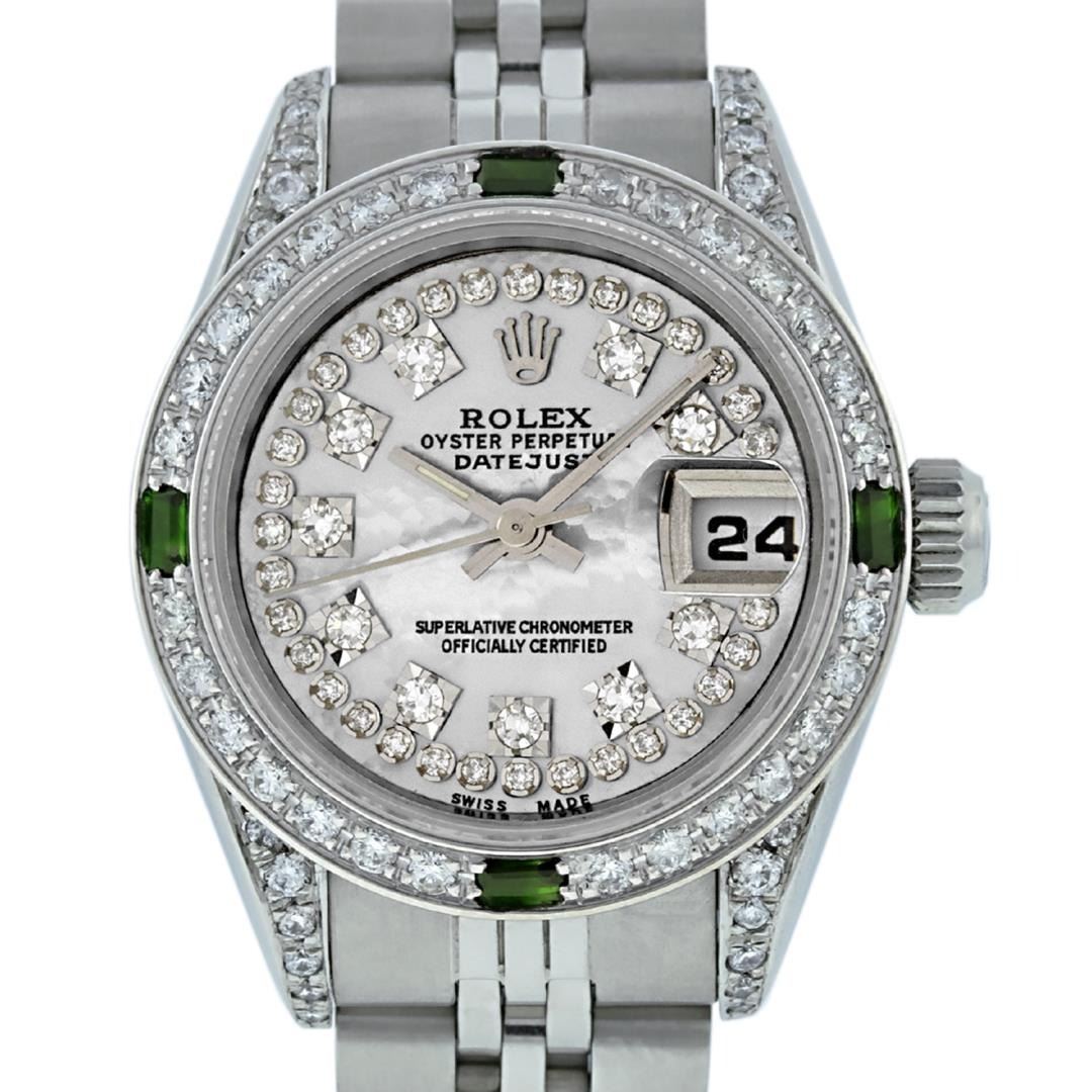 One Ladies Pre Owned Quickset Stainless Steel Rolex Datejust Polished Bright with Satin Finish, Serviced And Electronically Tested, Stainless Steel Case: 26mm, Stainless Steel Crown, Custom Diamond Lugs: 24 Added Diamonds On Lugs. Custom Bezel: New 18K White Gold Emerald Beadset Bezel, Diamond Count: 28 Diamonds + 4 Emeralds. Custom Crystal: New Sapphire With Date Window. Custom Hands: New Luminescent Hands. Rolex Movement: Automatic Winding Movement 2135. Custom Dial: Custom White String Dial With Added Diamonds, 43 Diamonds On Dial. Date Window: 3 O'Clock Position Date Display, Model: Datejust. Condition: G-6 Extra Fine. Rolex Bracelet: Stainless Steel Jubilee Band. Bright Polish And Satin Finish. 6.0 Inch Length, Adjustable. Standard Clasp, With Rolex Logo. This Watch Has Been Serviced Time Tested And Is In Excellent Condition It Is Free Of All Scratches And Dents.
